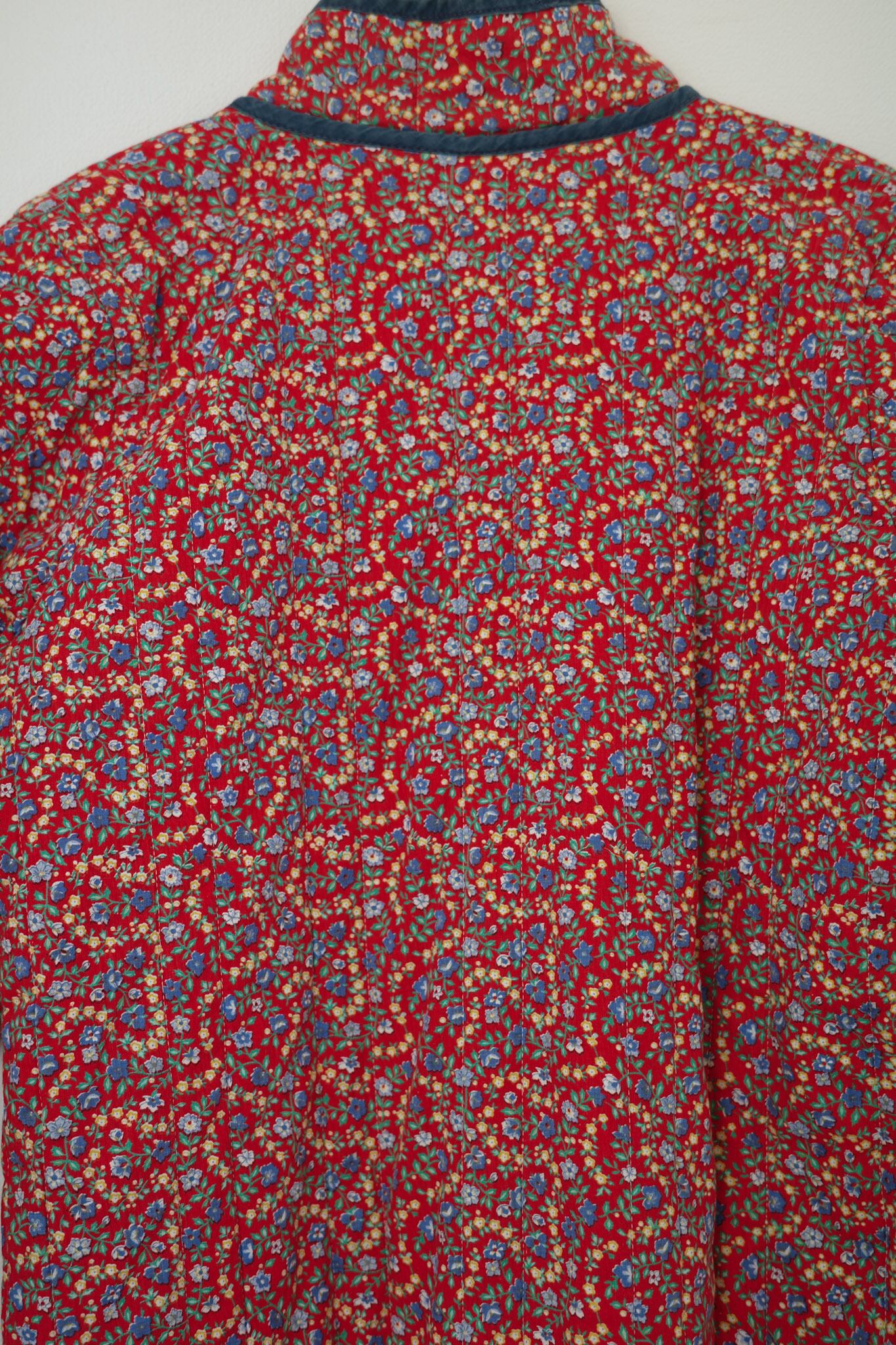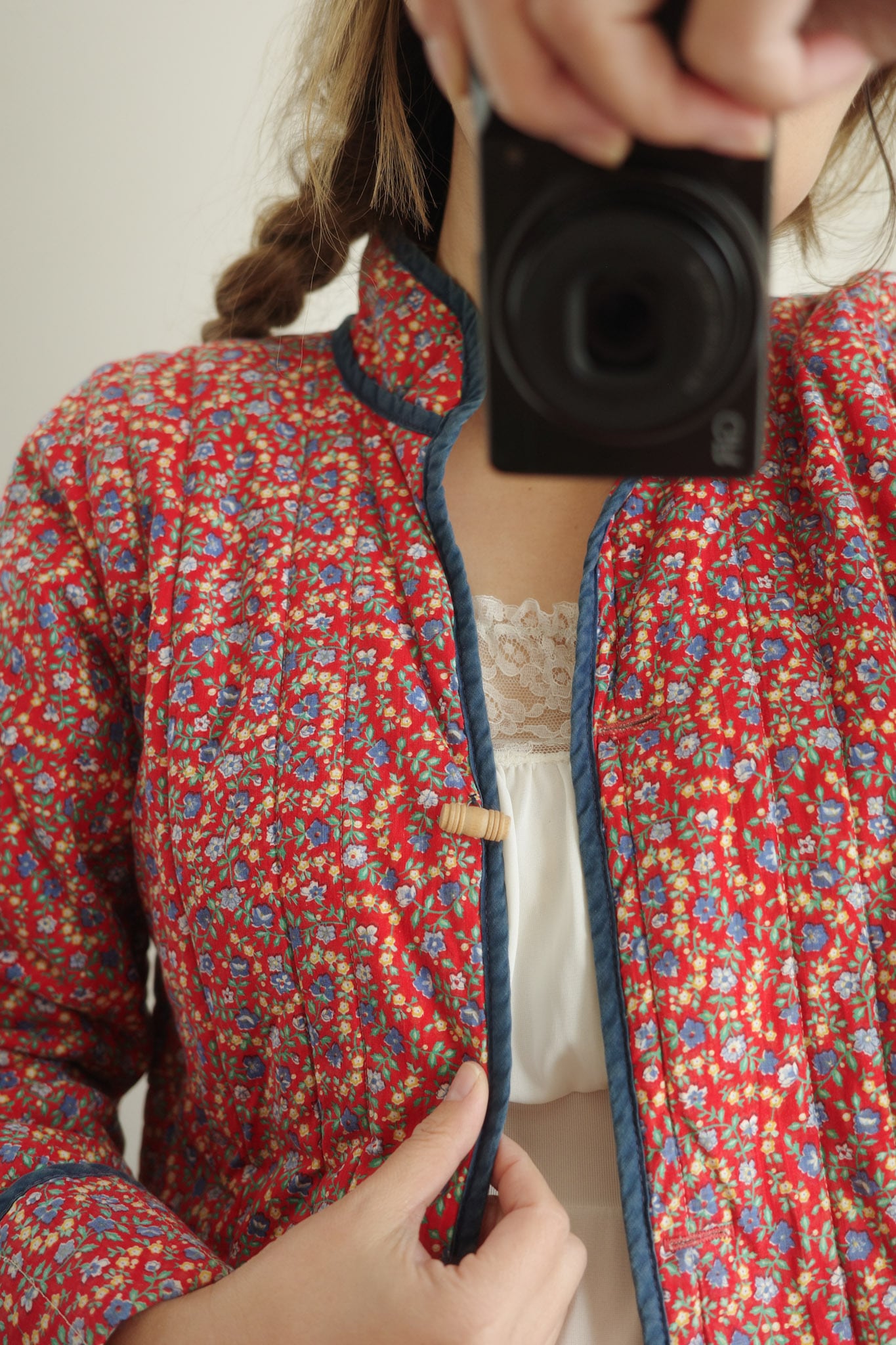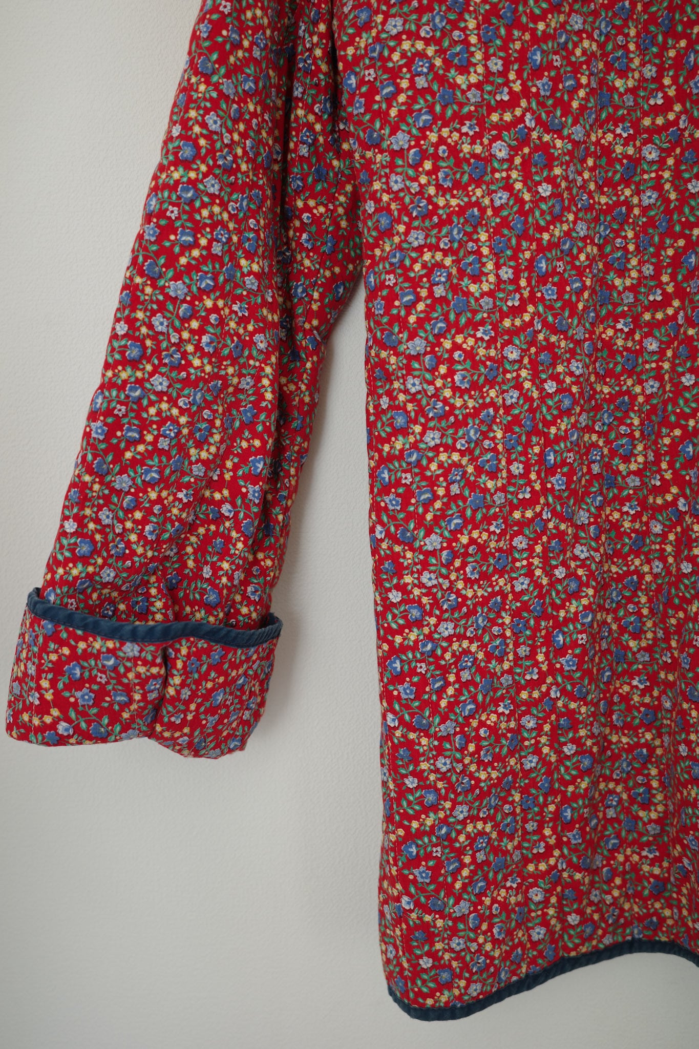 このヴィンテージフローラルパターンレッドキルティングジャケットは、華やかな花柄と温かみのあるキルティングが特徴的な一着です。