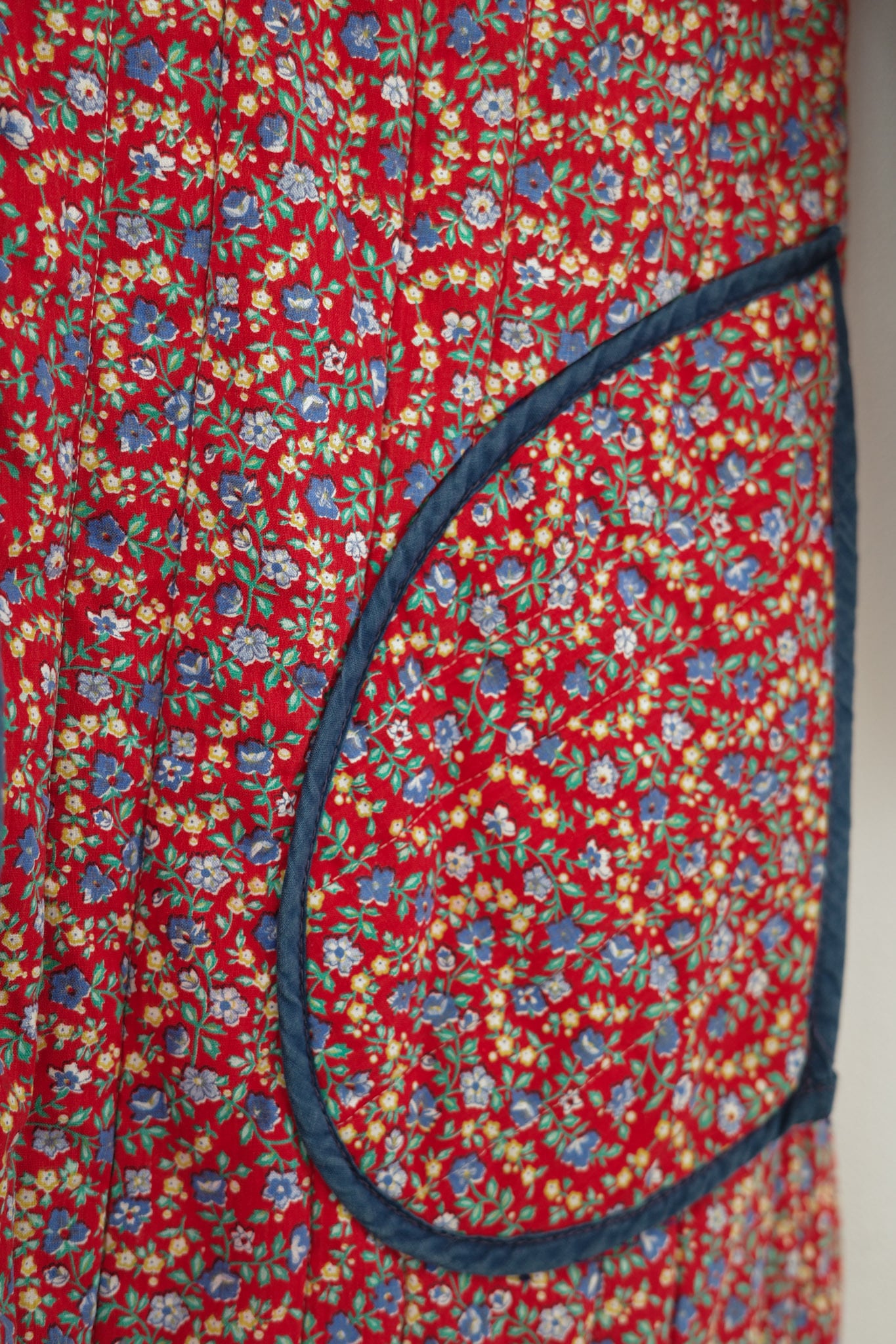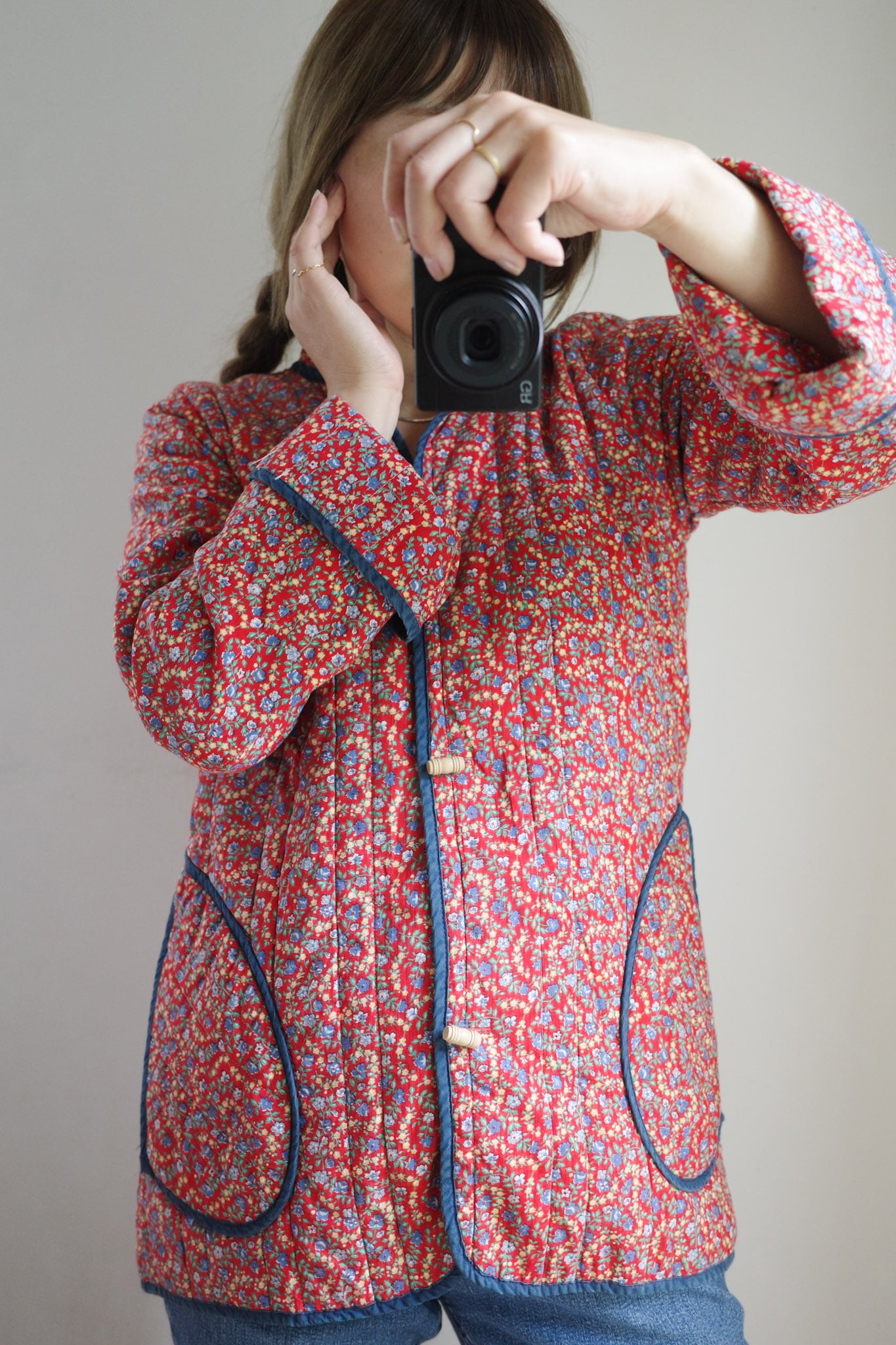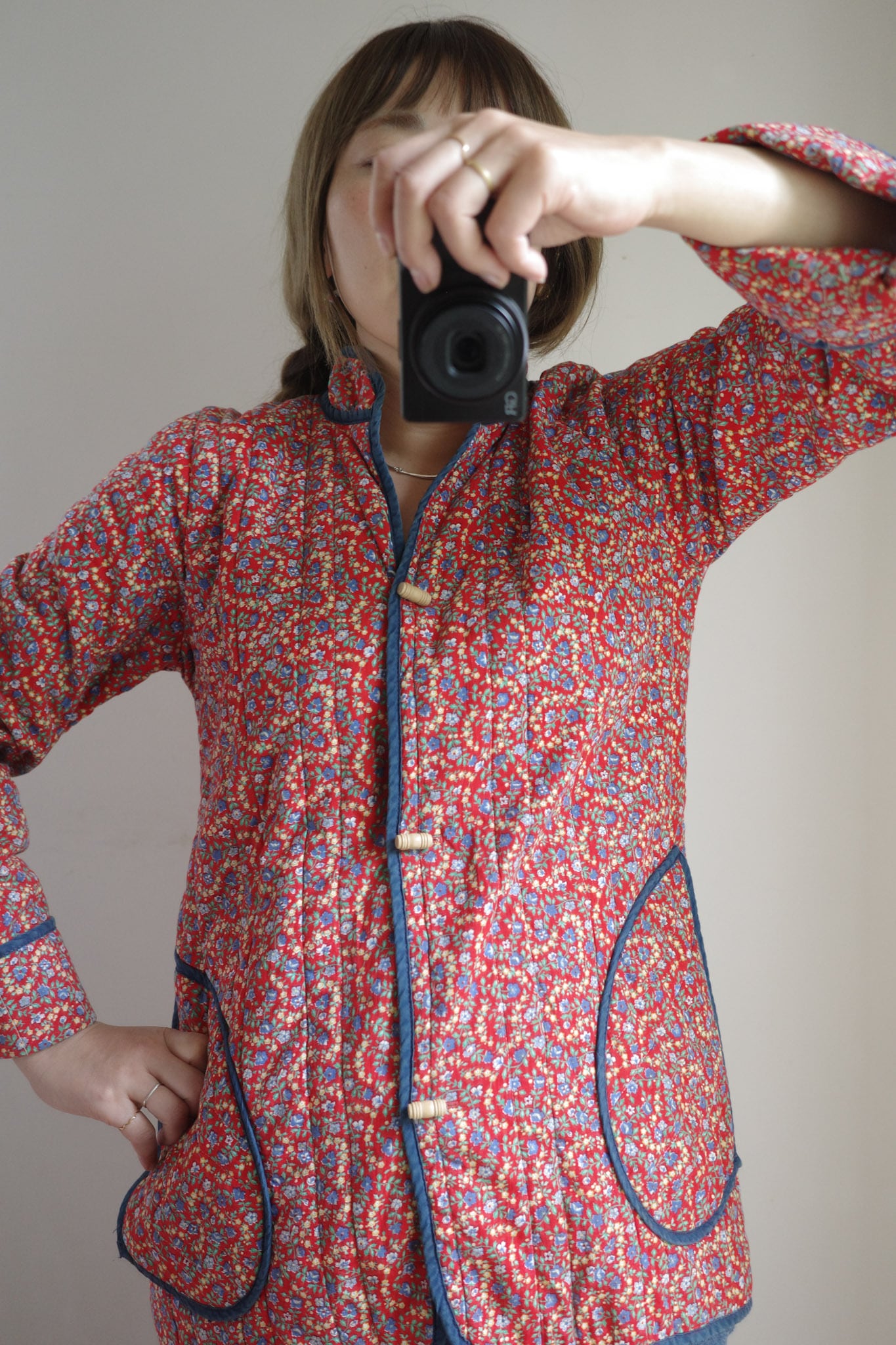 このヴィンテージフローラルパターンレッドキルティングジャケットは、華やかな花柄と温かみのあるキルティングが特徴的な一着です。