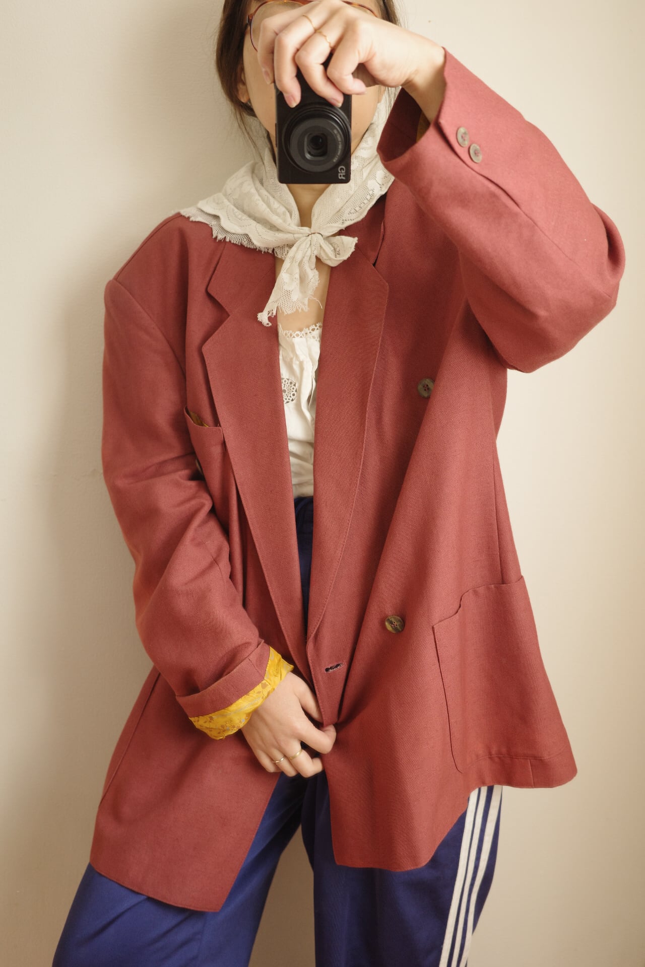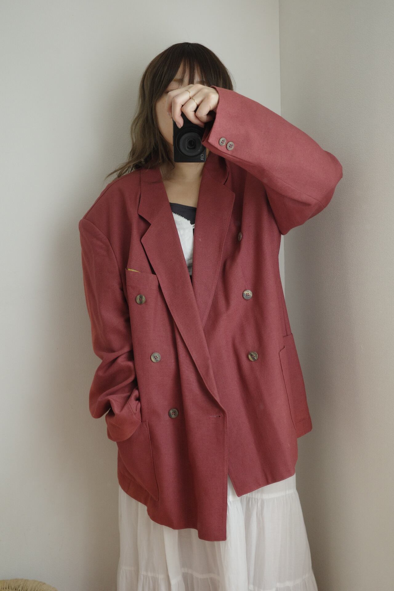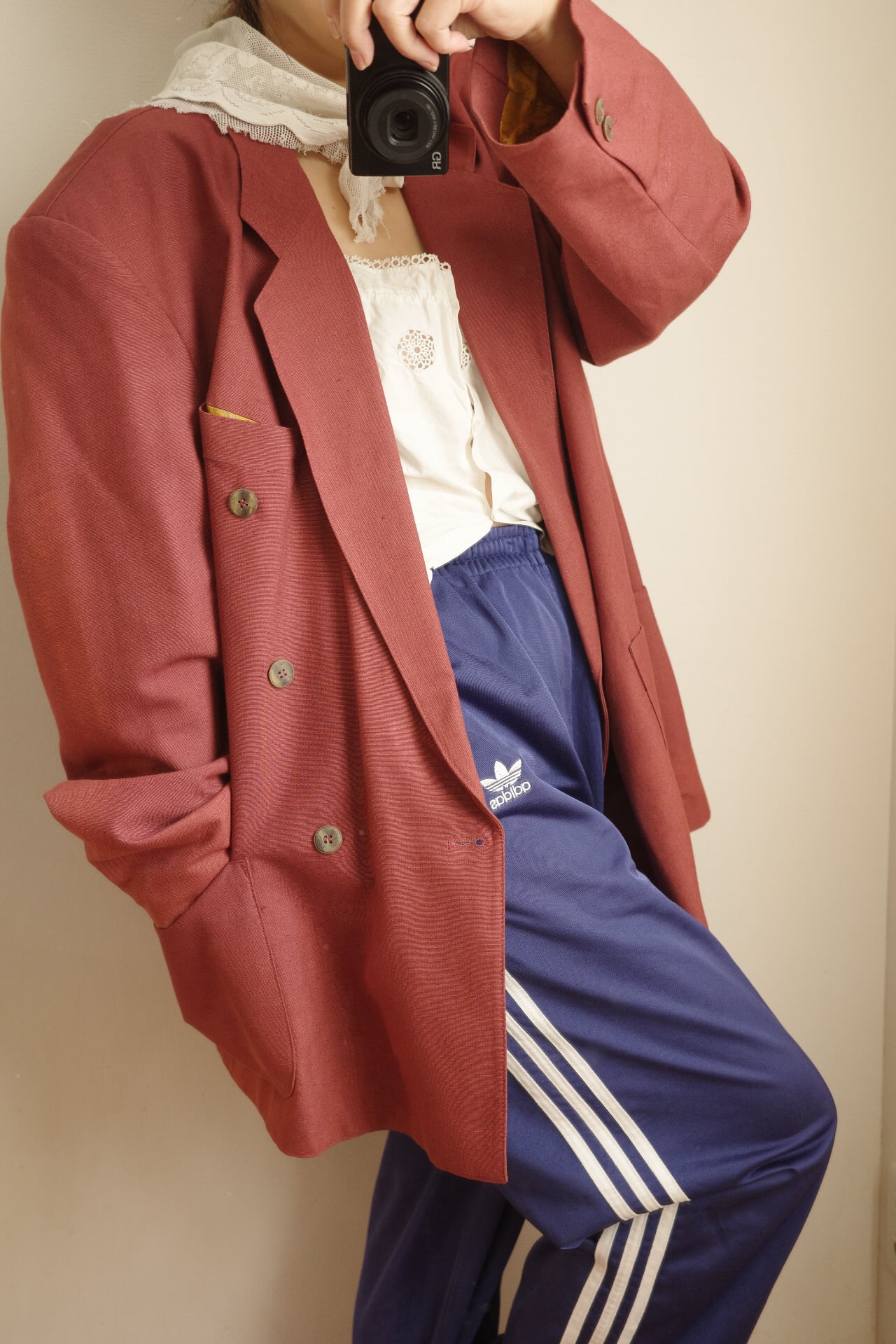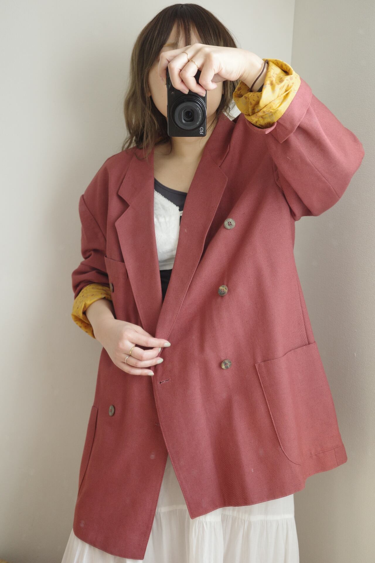 この1990年代のヴィンテージダブルテーラードジャケットは、オレンジピンクブラウンの絶妙な配色が特徴で、レトロな魅力を放つアイテムです。ダブルテーラードデザインで、洗練された印象を与えつつ、カジュアルからフォーマルまで幅広いスタイルに対応可能です。