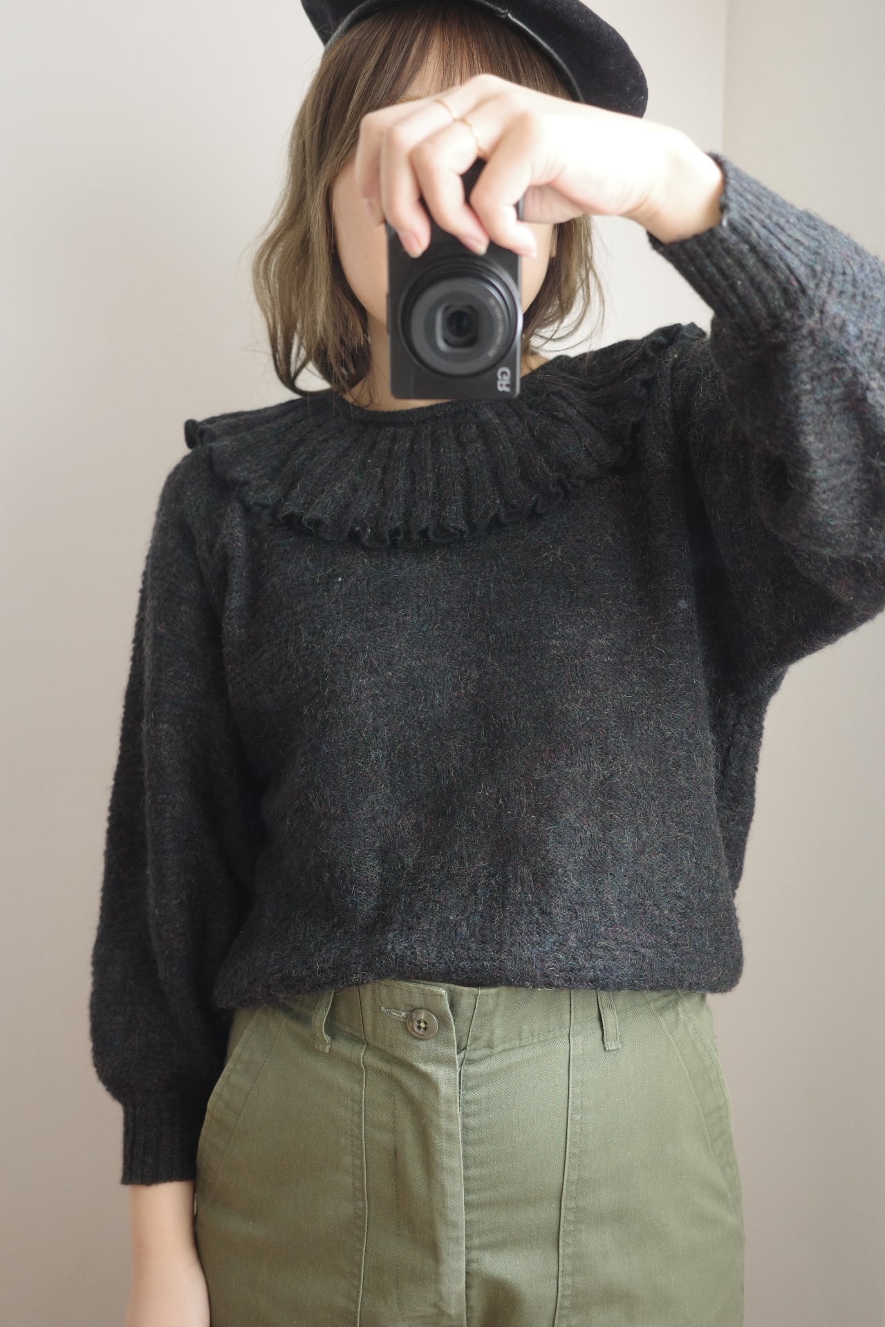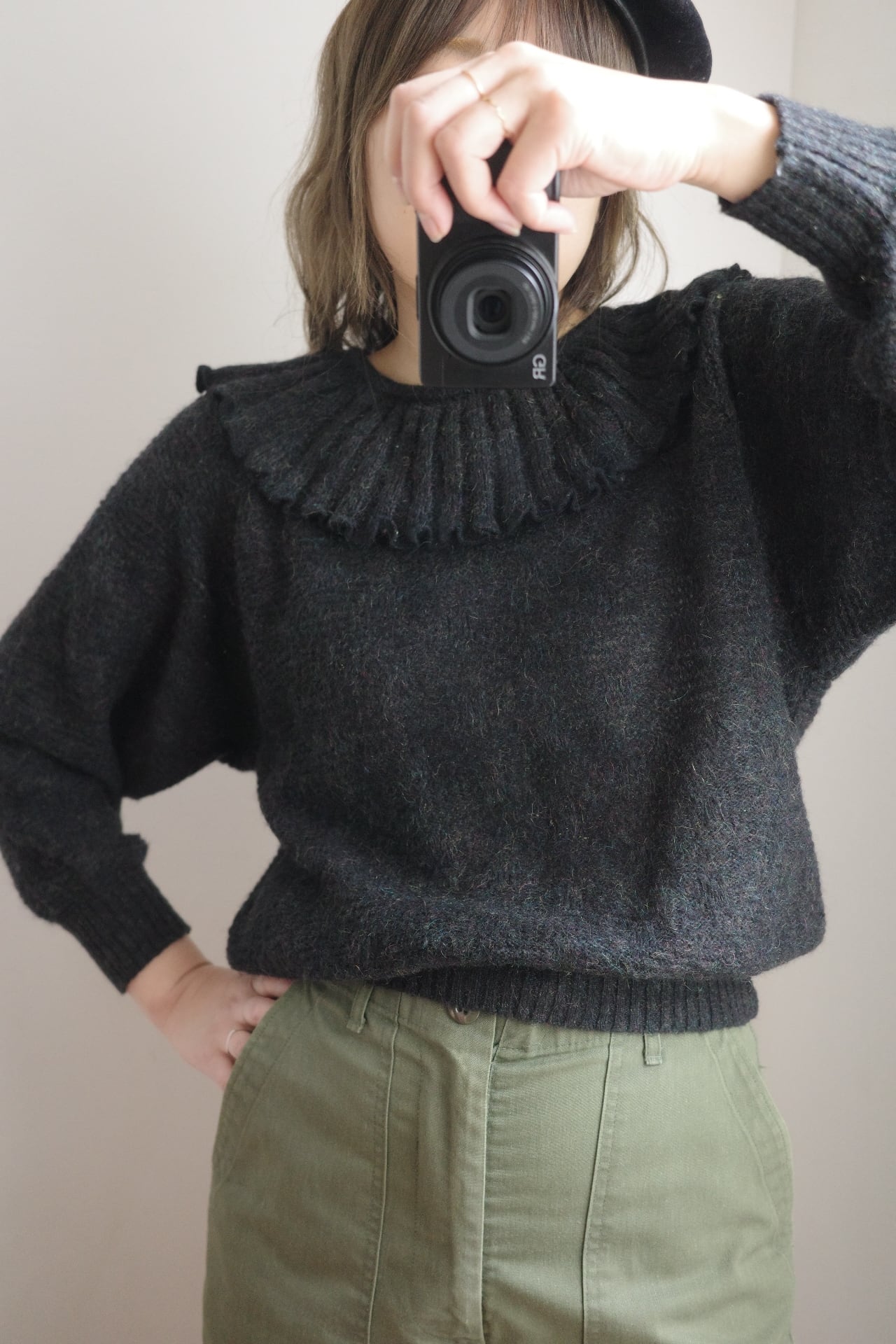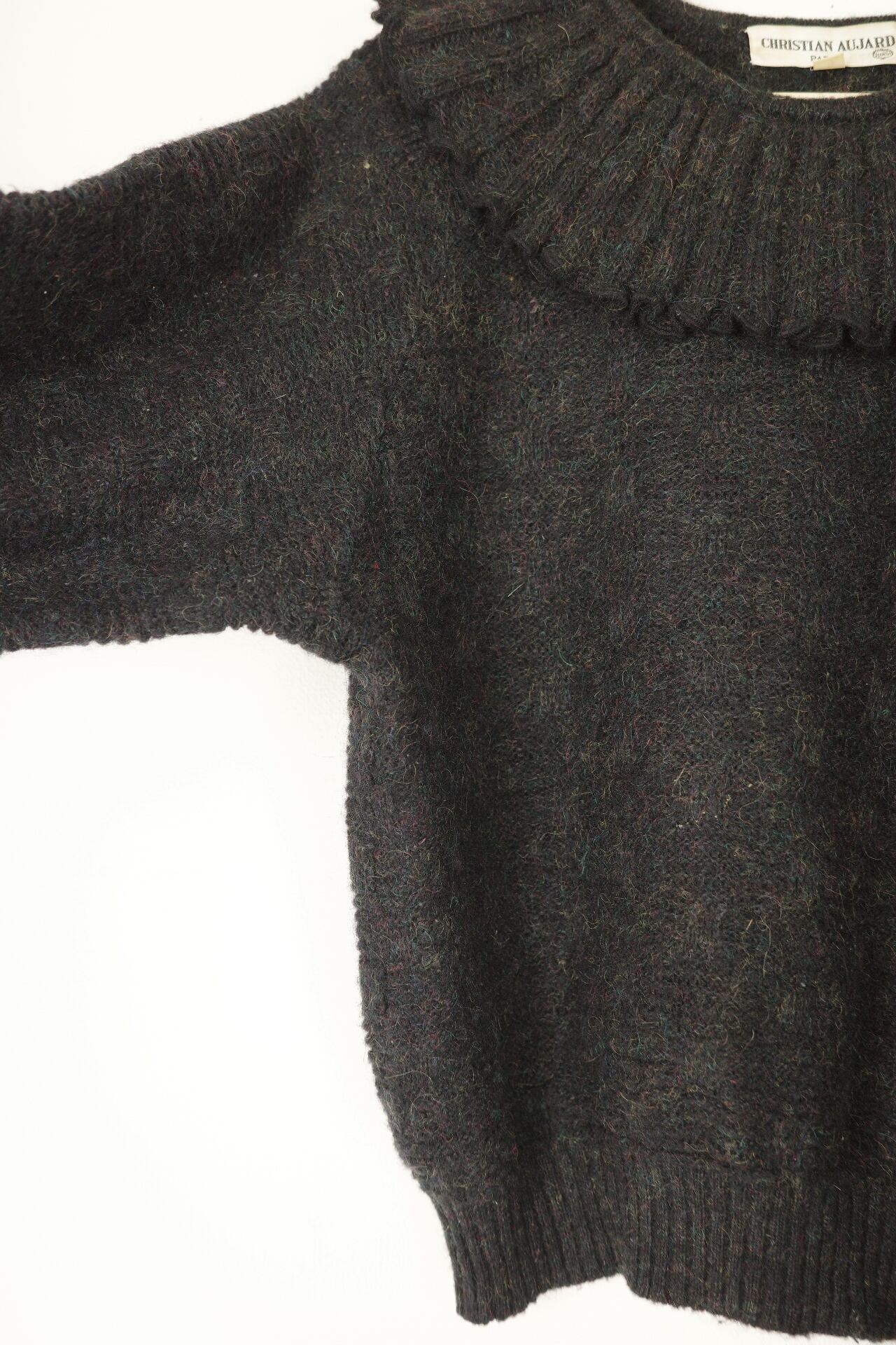 ■ vintage frill collar charcoal black knit top