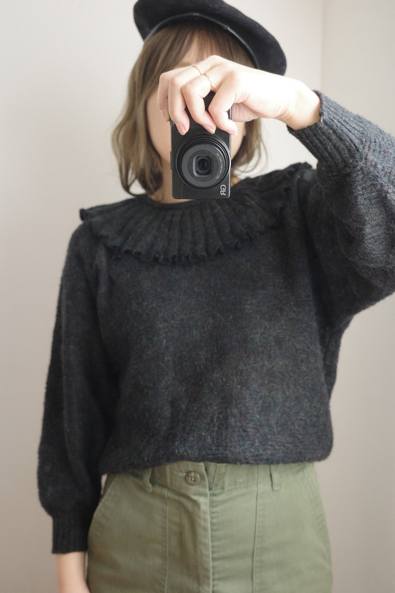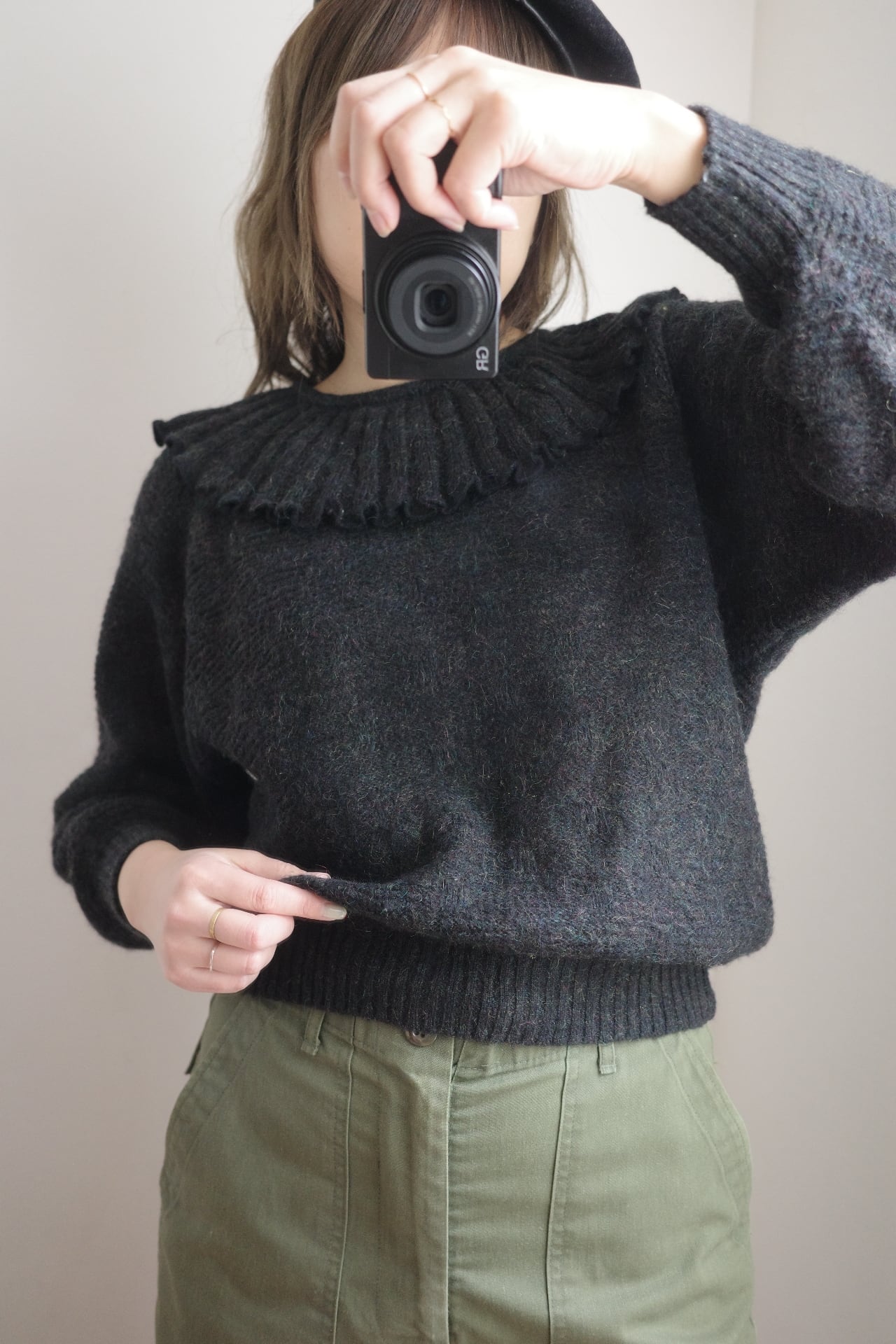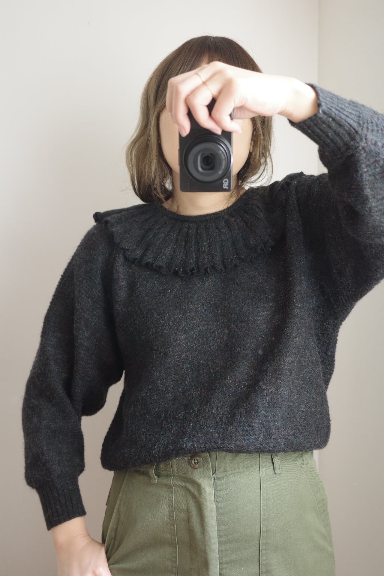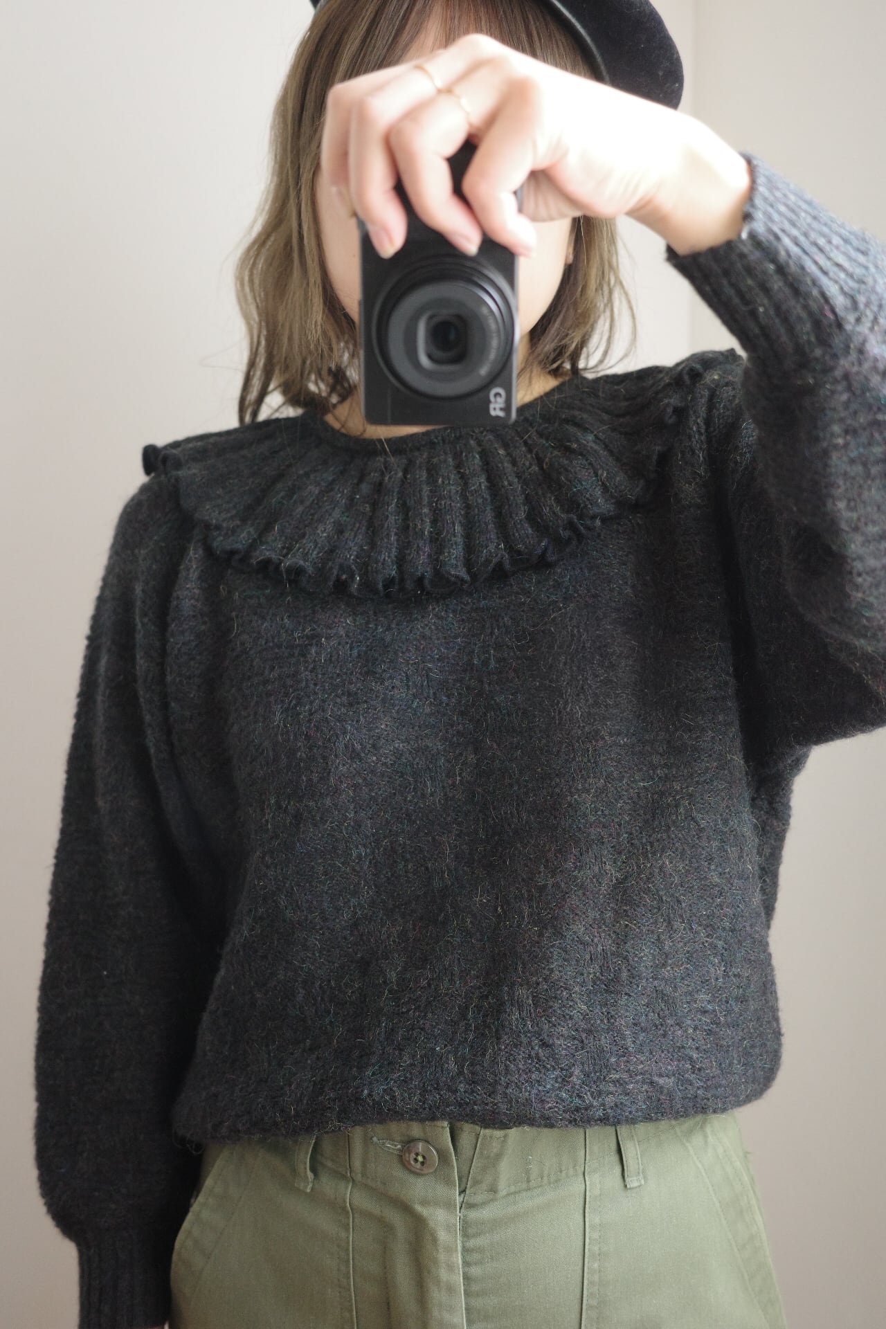 ■ vintage frill collar charcoal black knit top