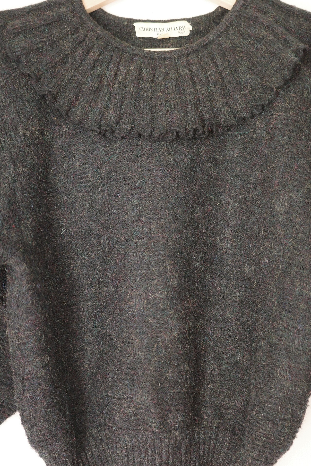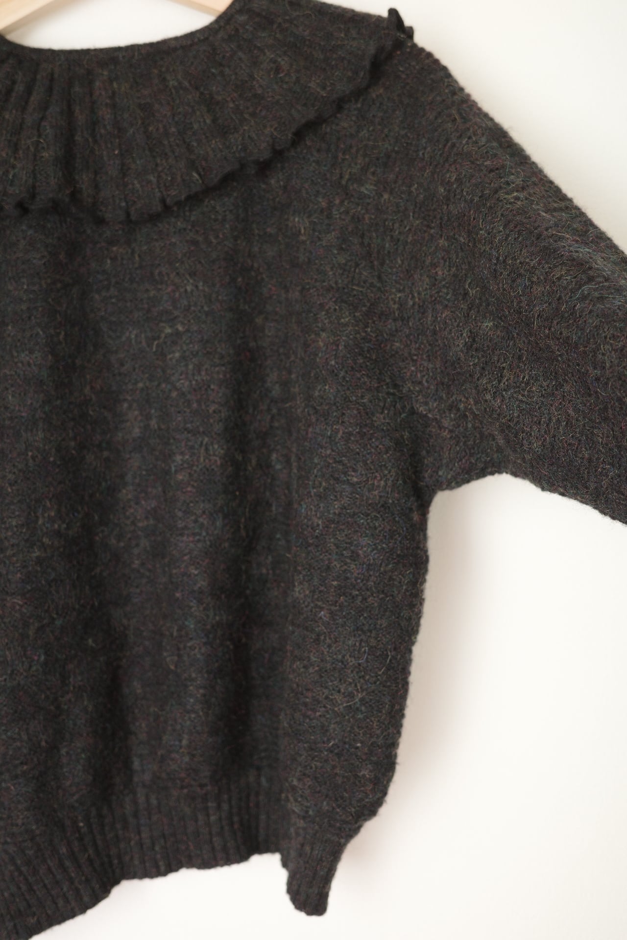 このヴィンテージフリルカラーのチャコールブラックニットトップは、フリルな襟が特徴で柔らかいニットでとても着心地が良いアイテムです。