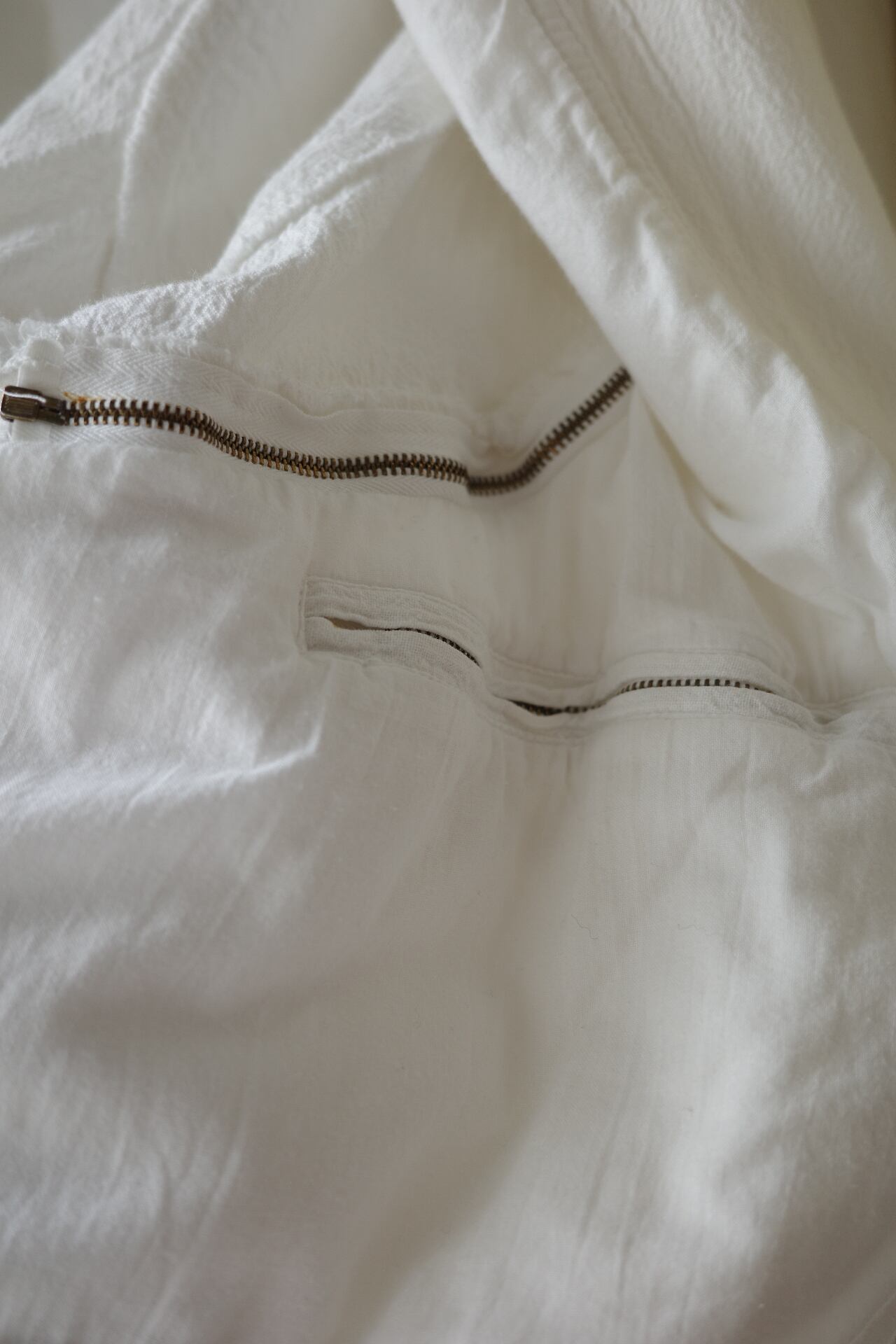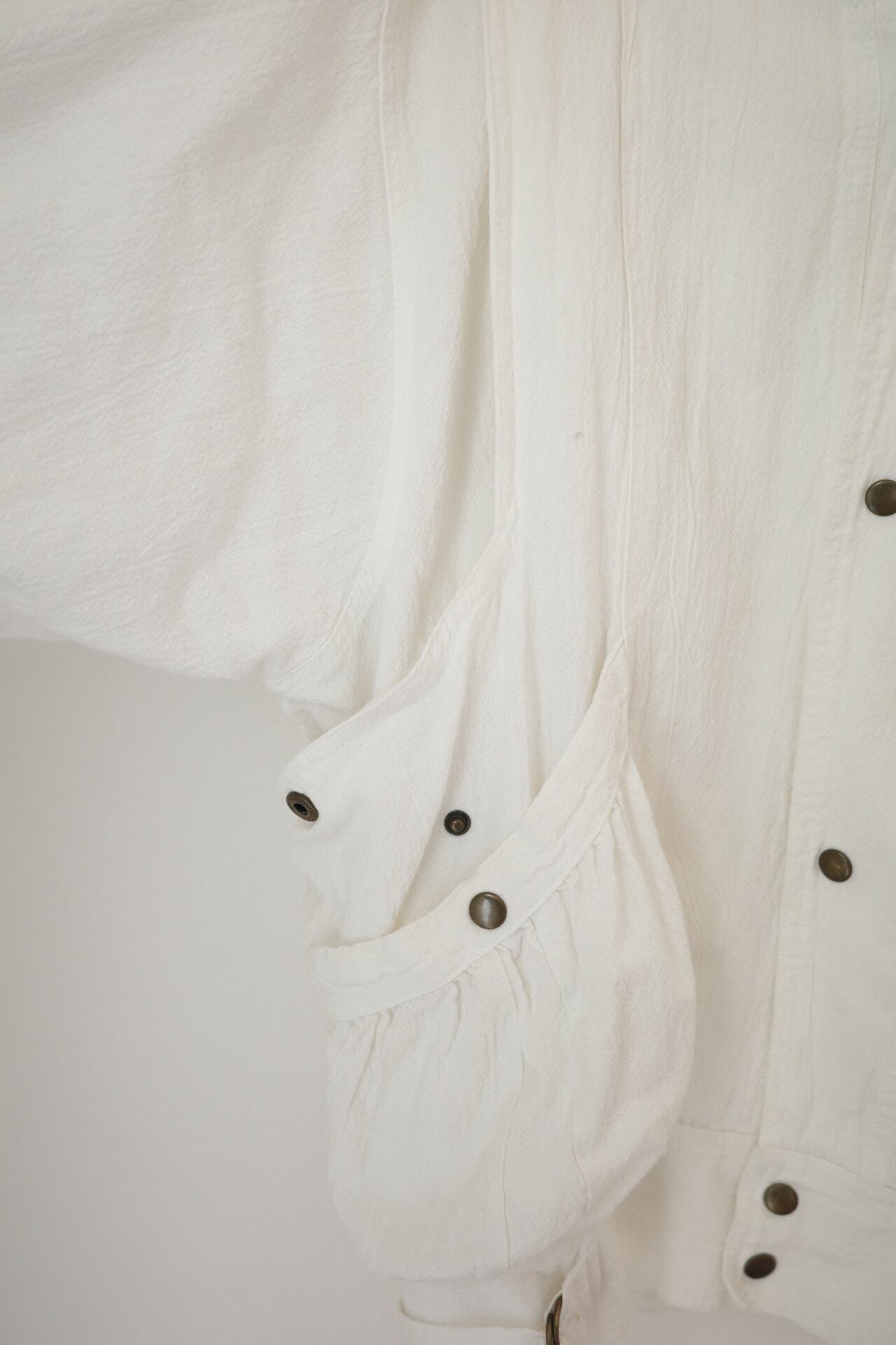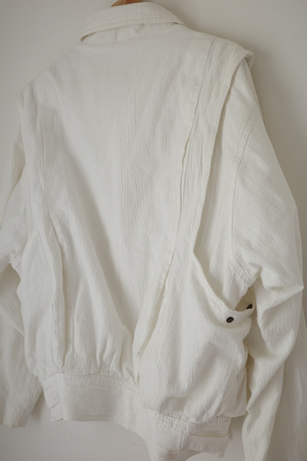この1980年代のホワイトコットンジャケットは、スタイリッシュで versatile なデザインが魅力のアイテムです。ジッパーのディテールはもちろん、着用方法に応じて2wayで楽しめるのが特徴です。軽やかな素材感が心地よく、季節を問わず活躍する一着です。
