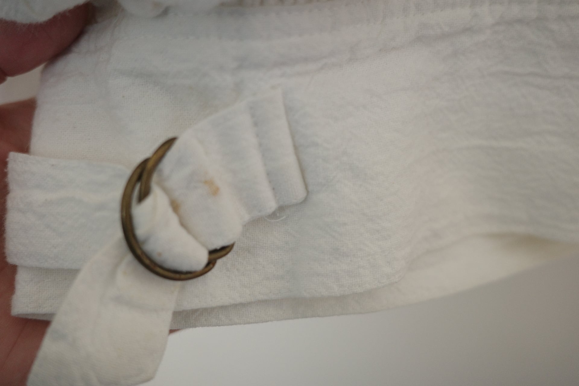 裾の調節ベルトの箇所にシミとジッパーの部分に錆がついた箇所があります。(写真16〜19枚目)