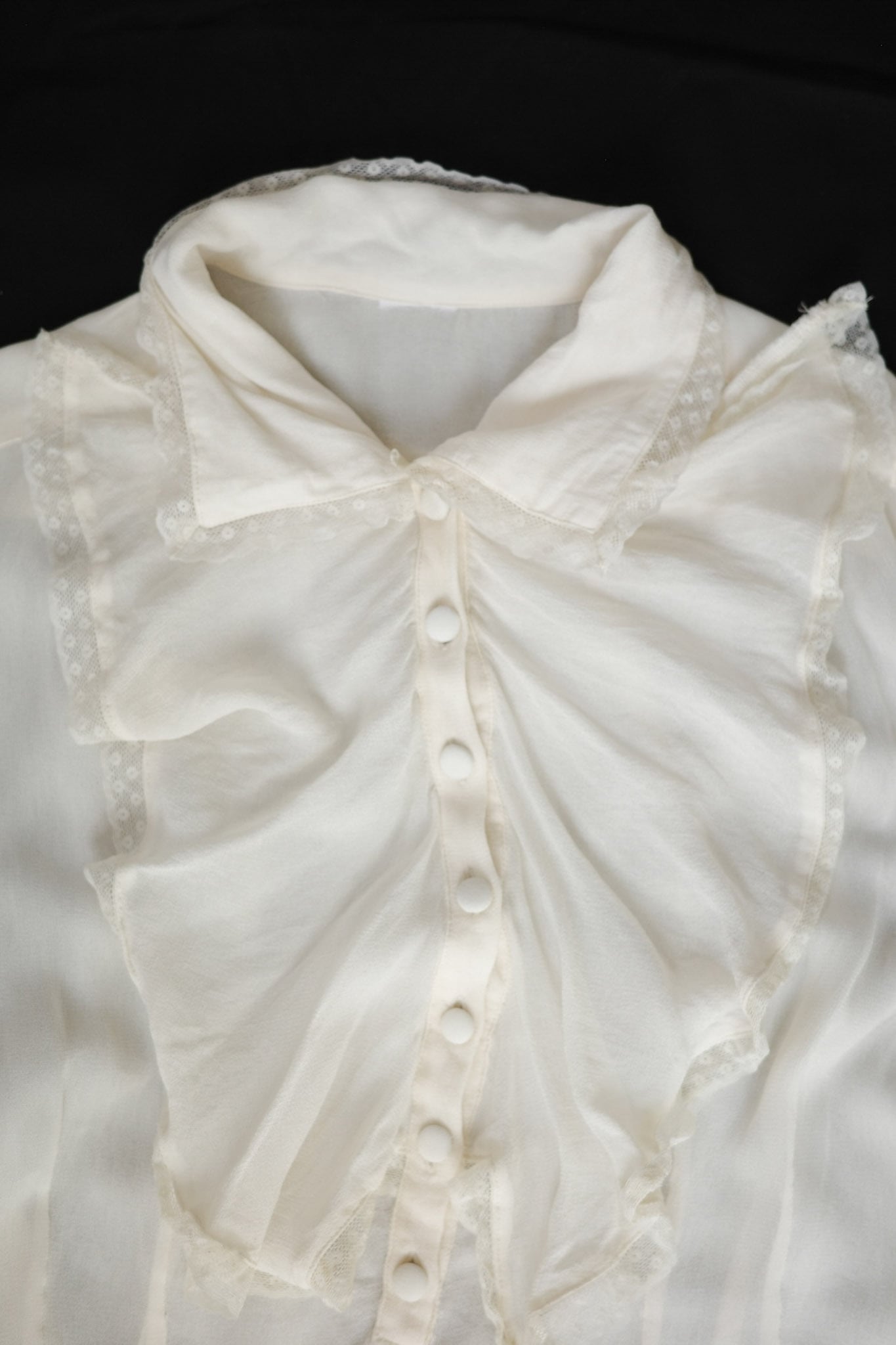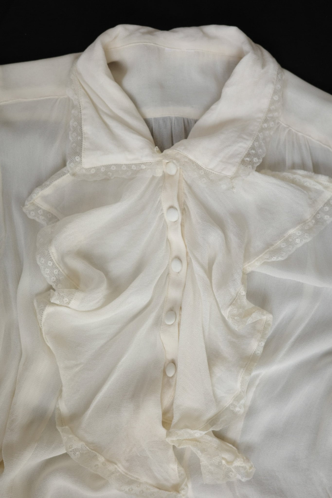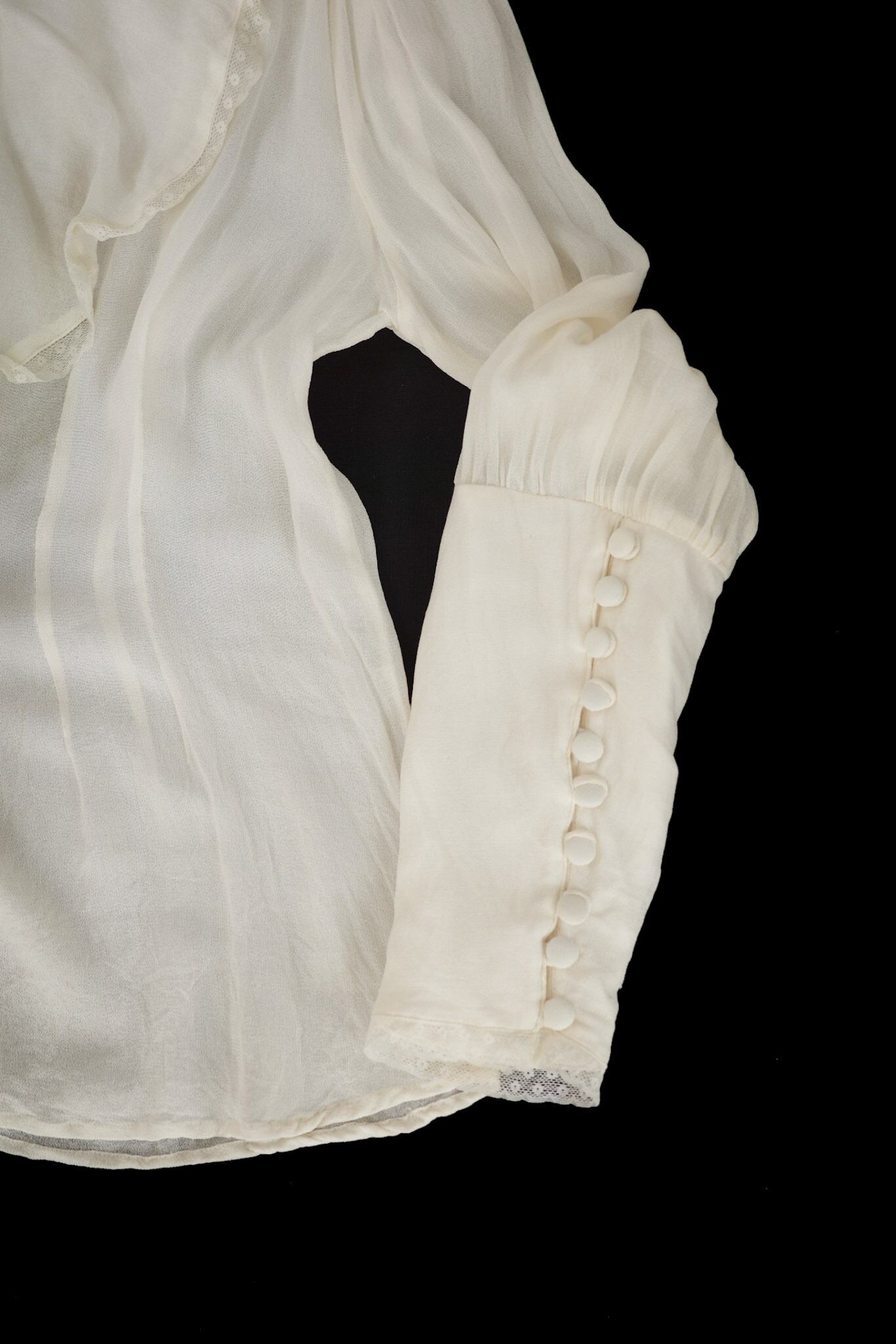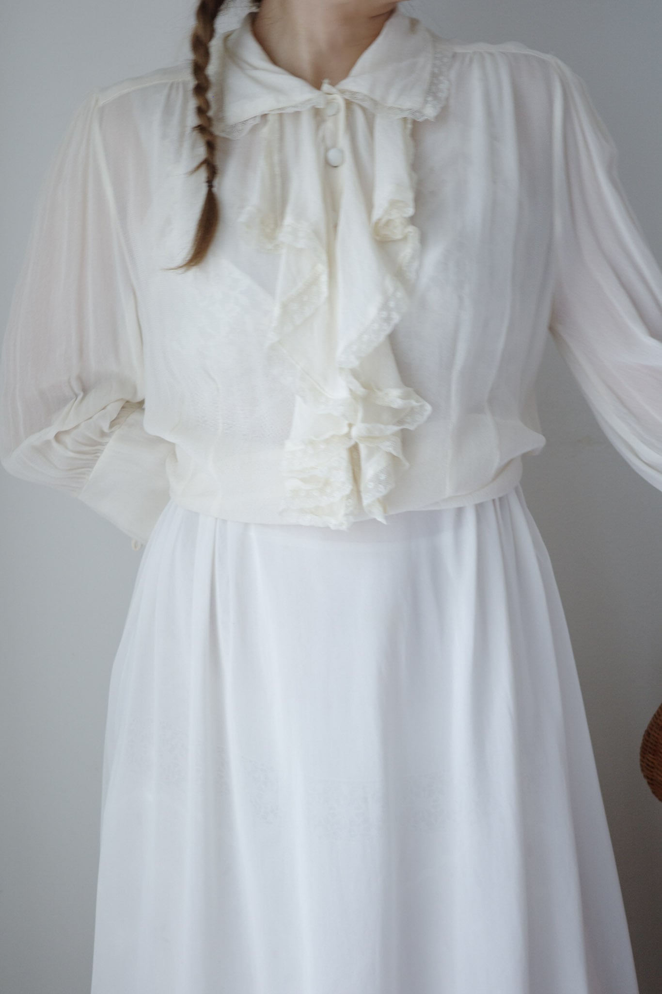 この1970年代のヴィンテージアイボリーシフォンブラウスは、柔らかで軽やかな素材感が特徴です。