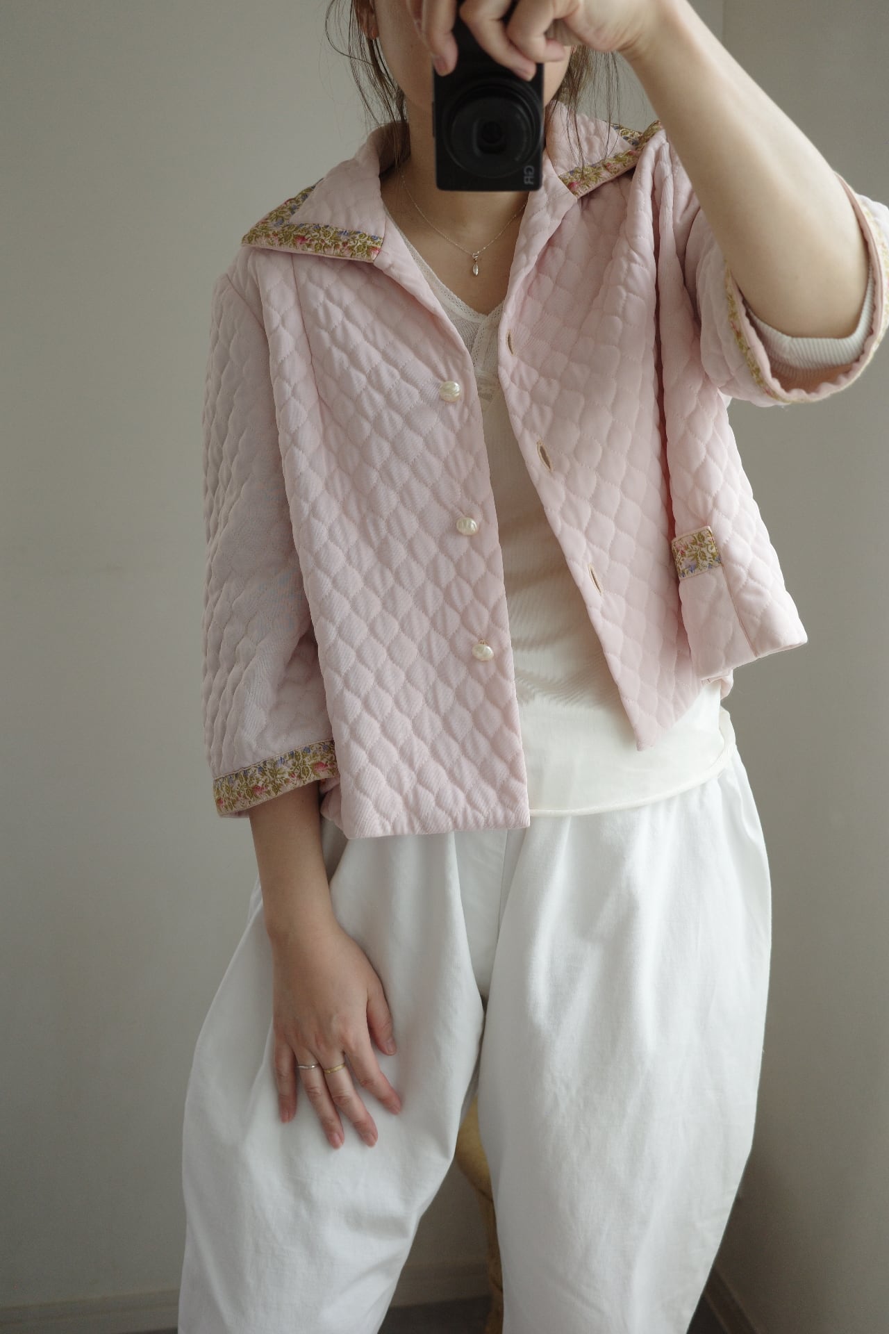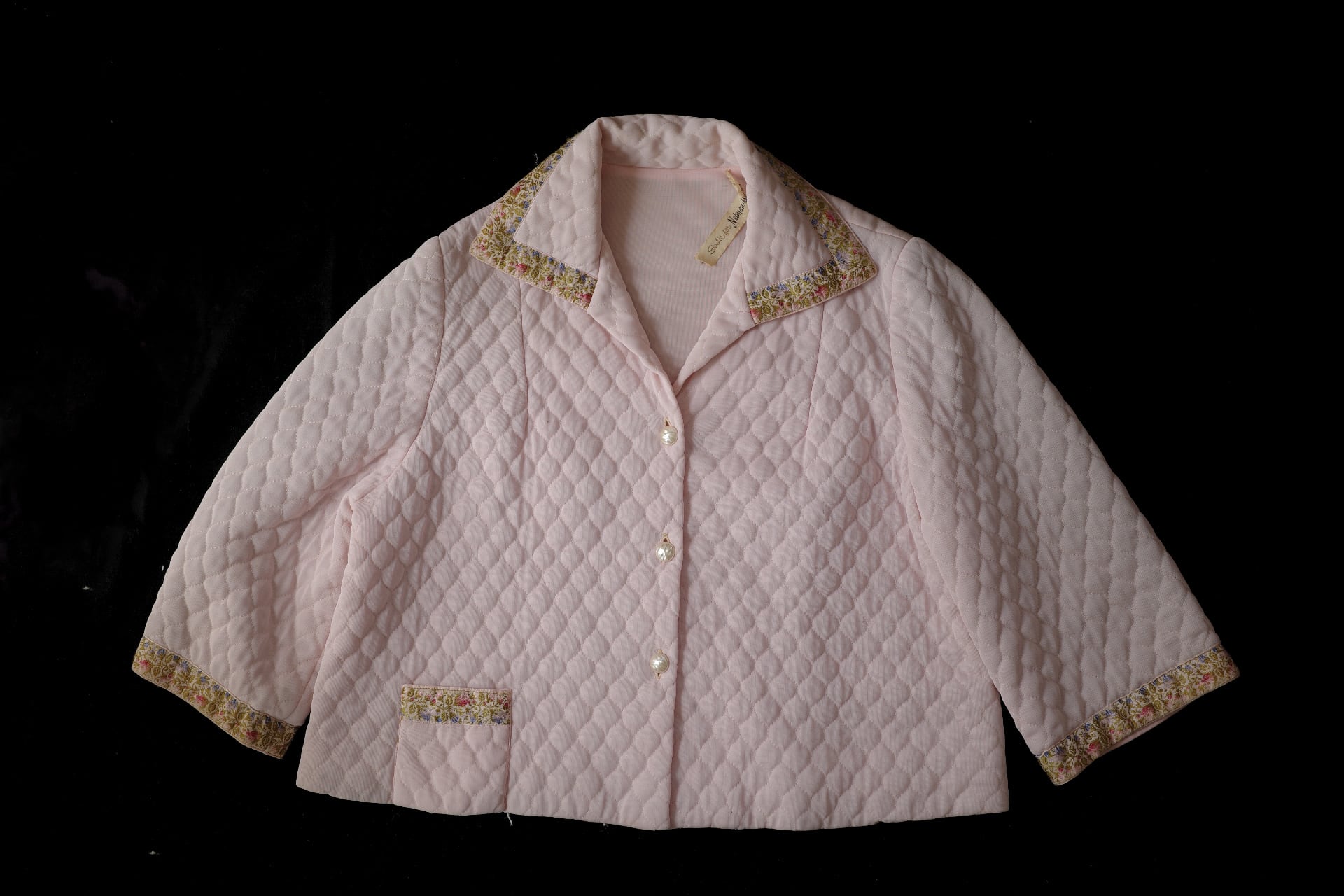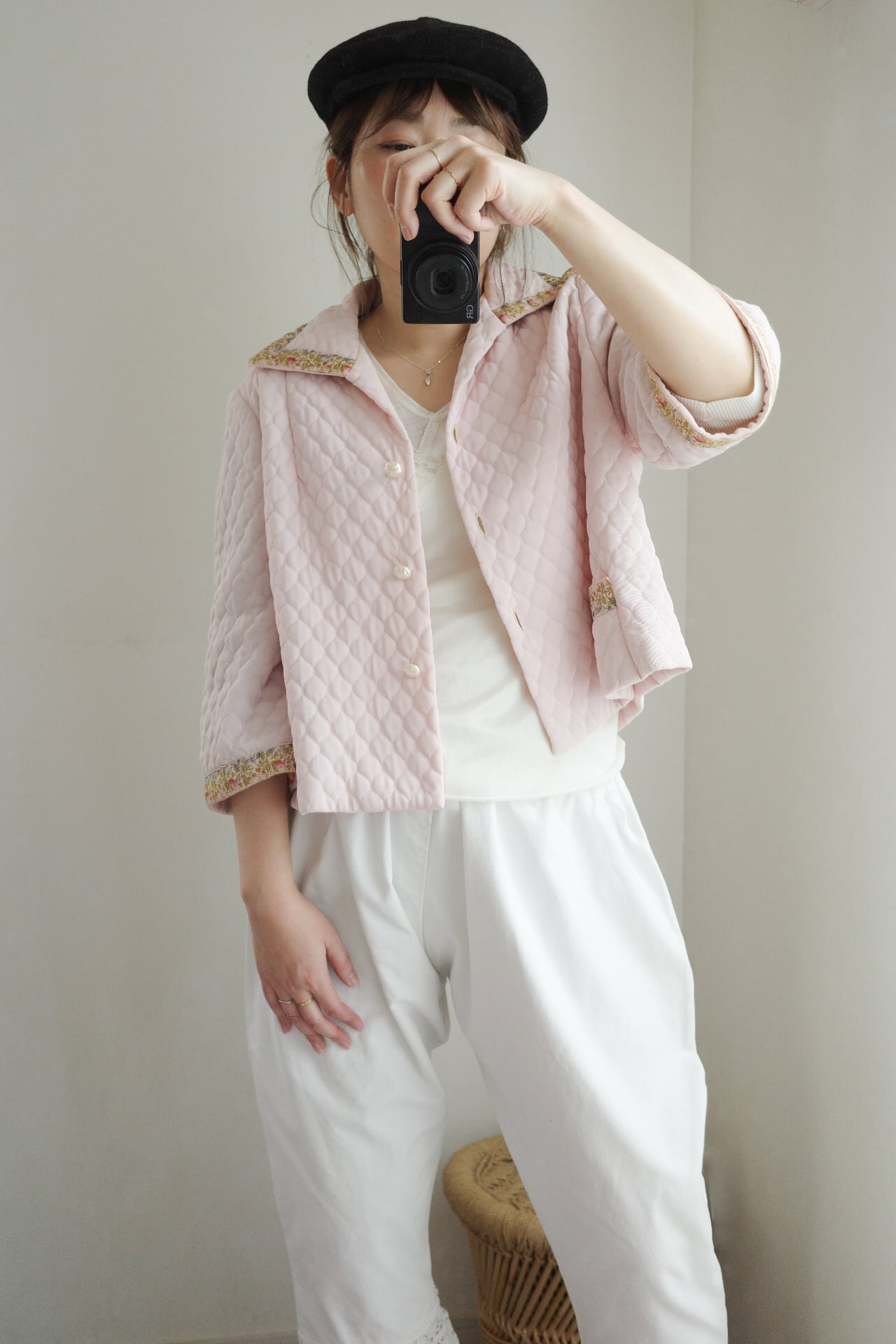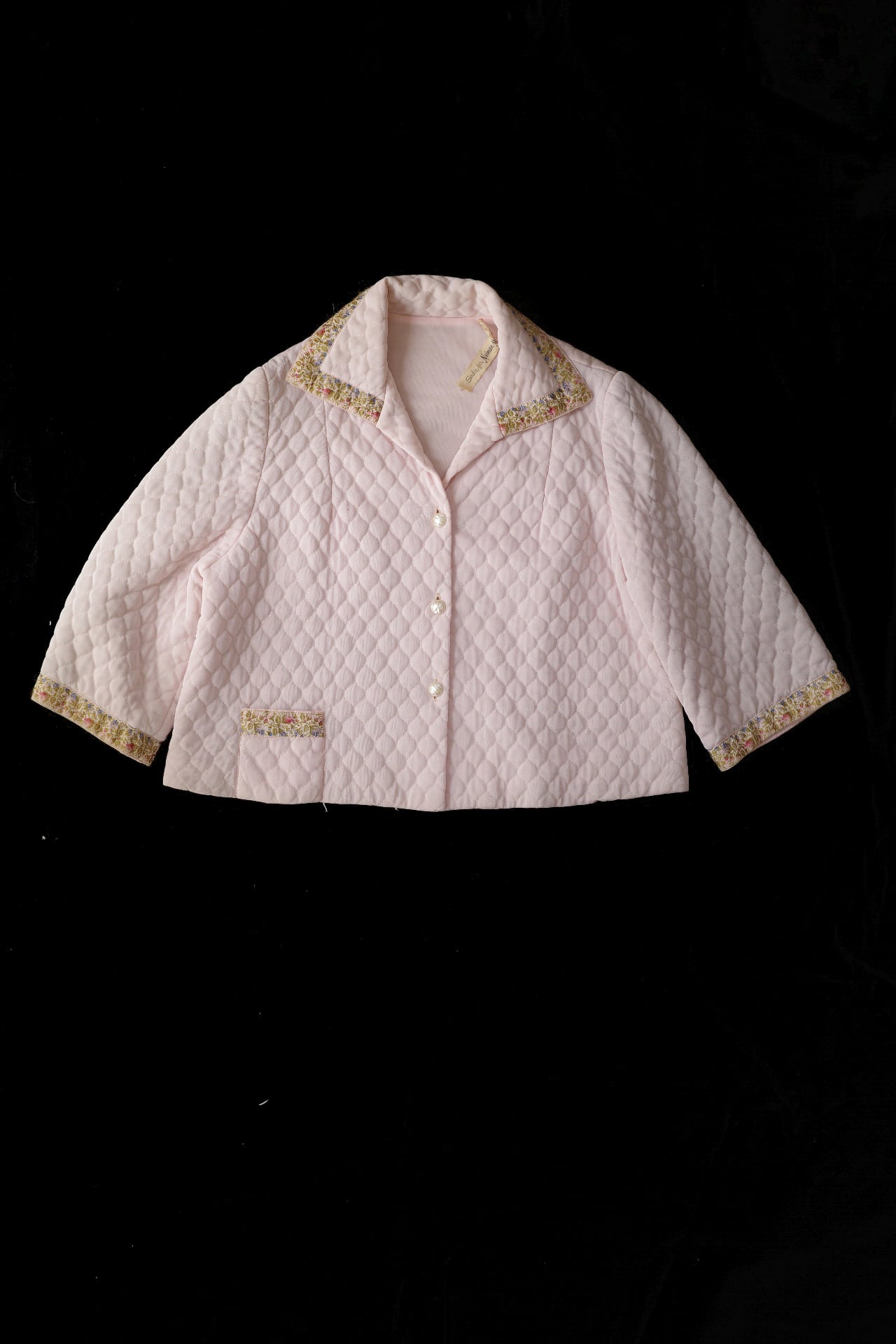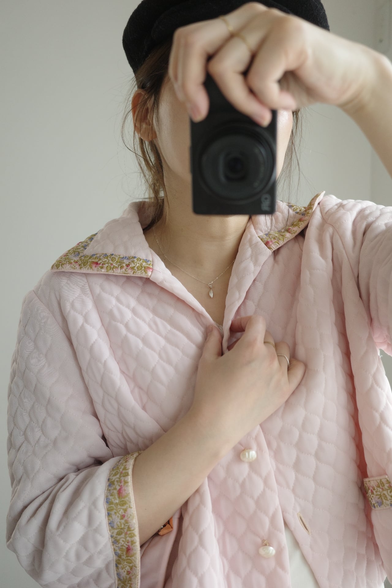 このヴィンテージのピンクキルトベッドローブは、柔らかで包み込まれるような素材感が特徴です。