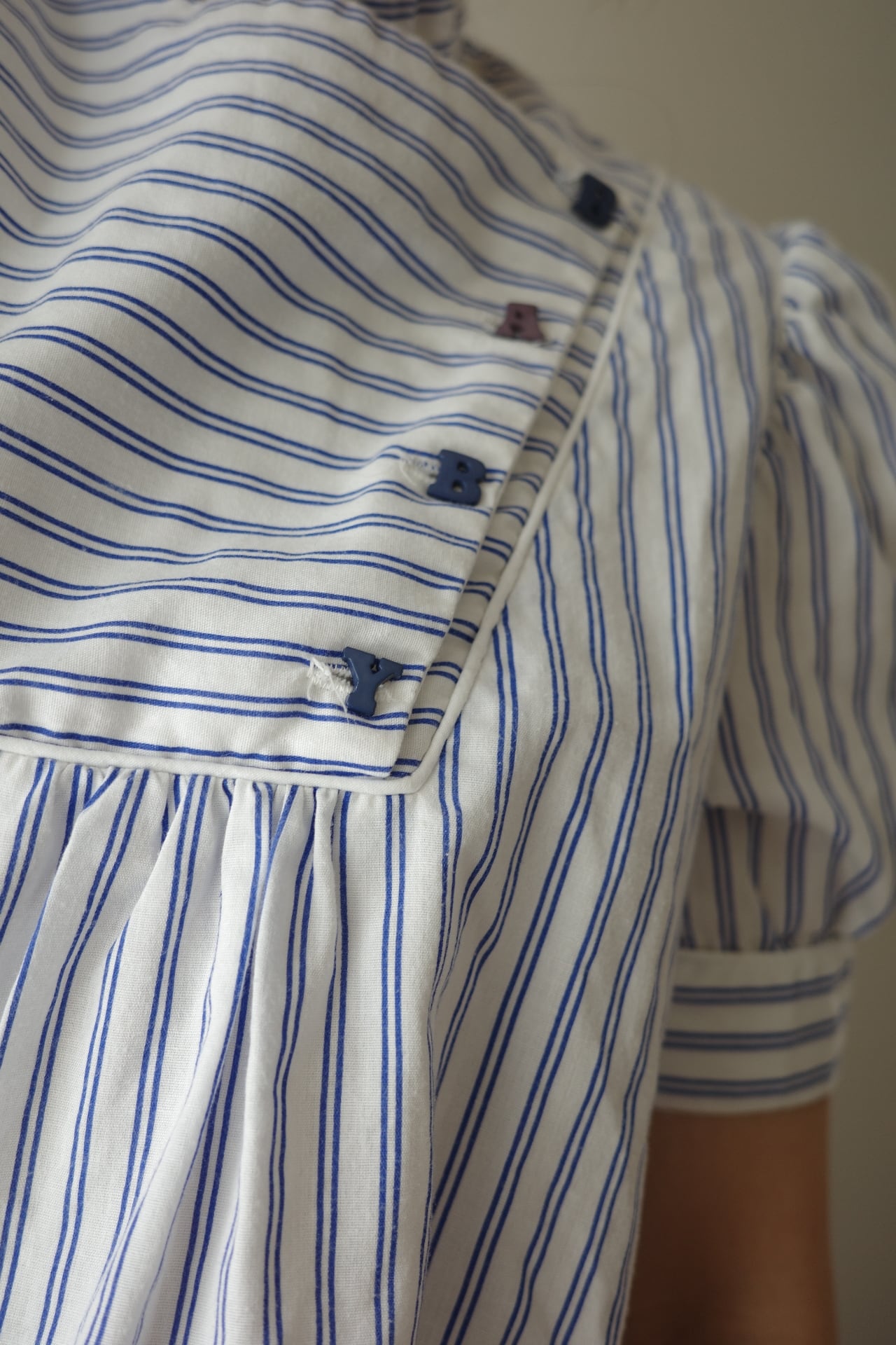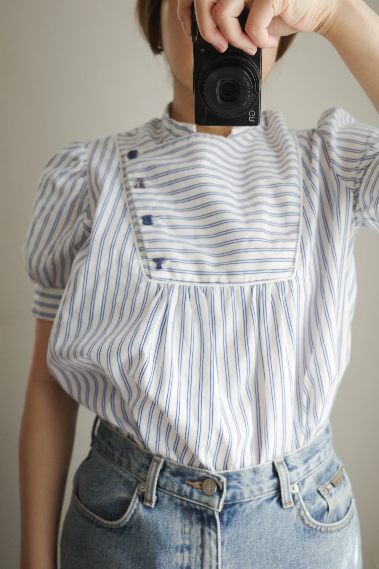 このヴィンテージのパフスリーブストライプブラウスは、愛くるしいパフスリーブとストライプ柄が特徴のアイテムです。風通しの良い軽やかな素材感で、どんなシーンにもフィットする優れた一着です。
