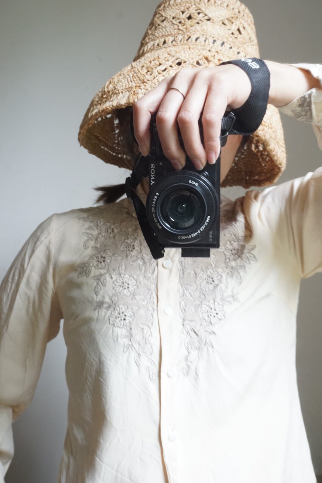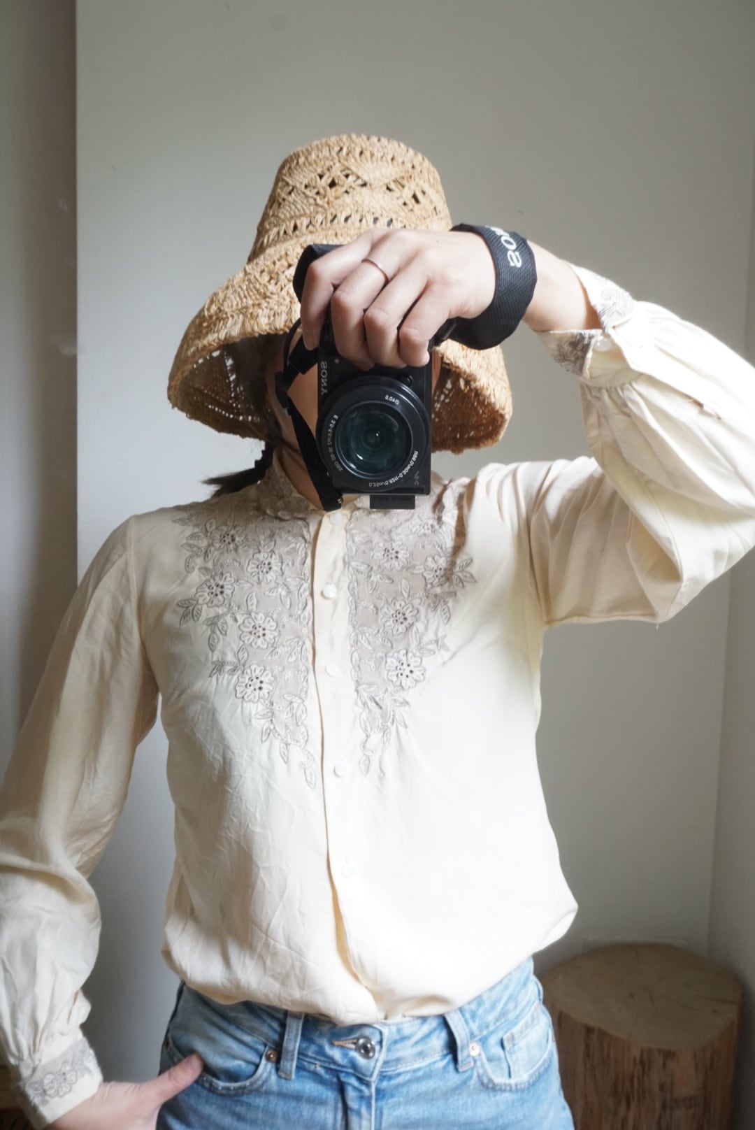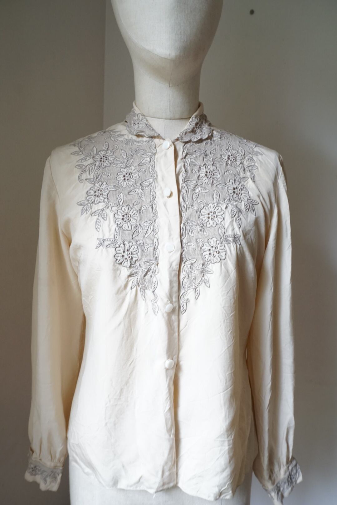 刺繍のお花が可愛いシルク素材、ヨーロッパのヴィンテージブラウストップスです。