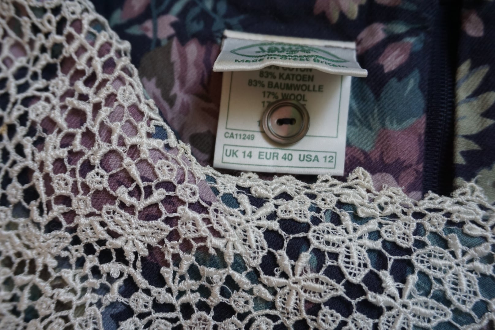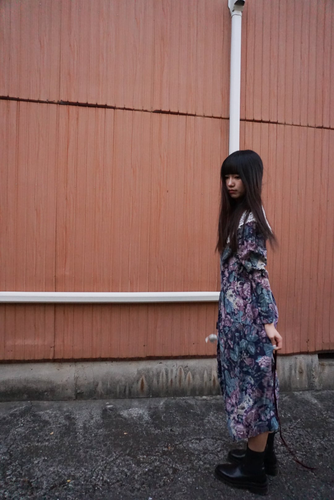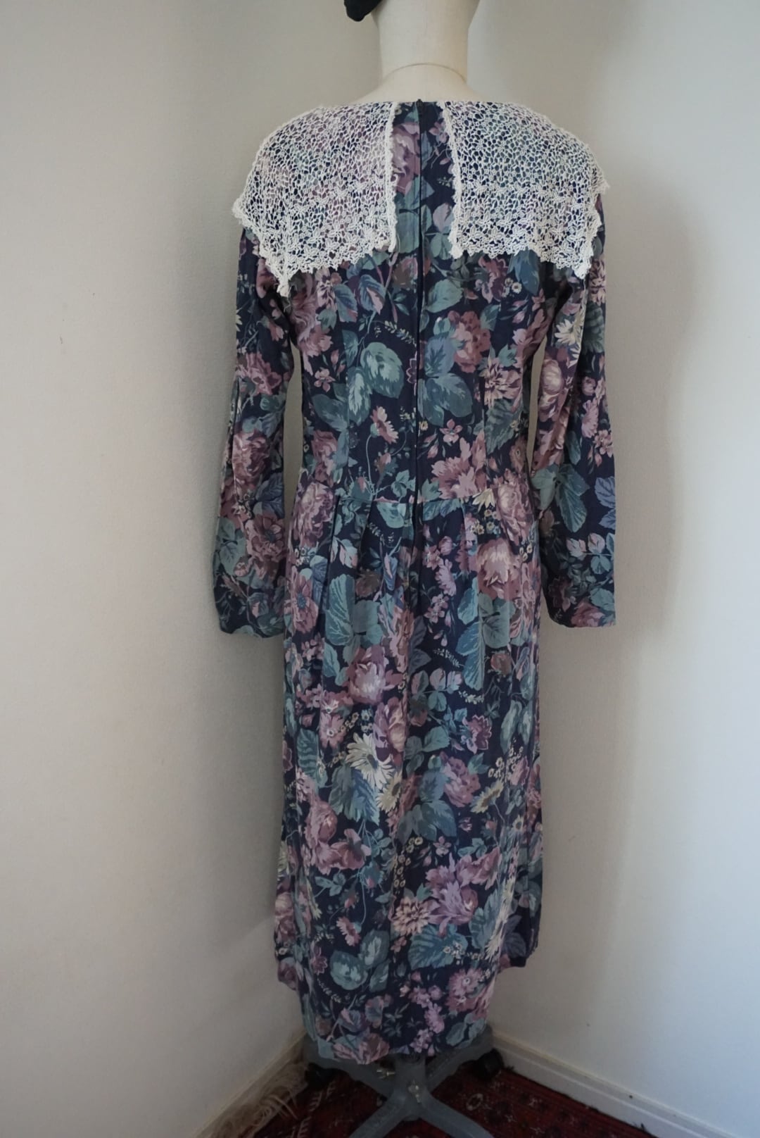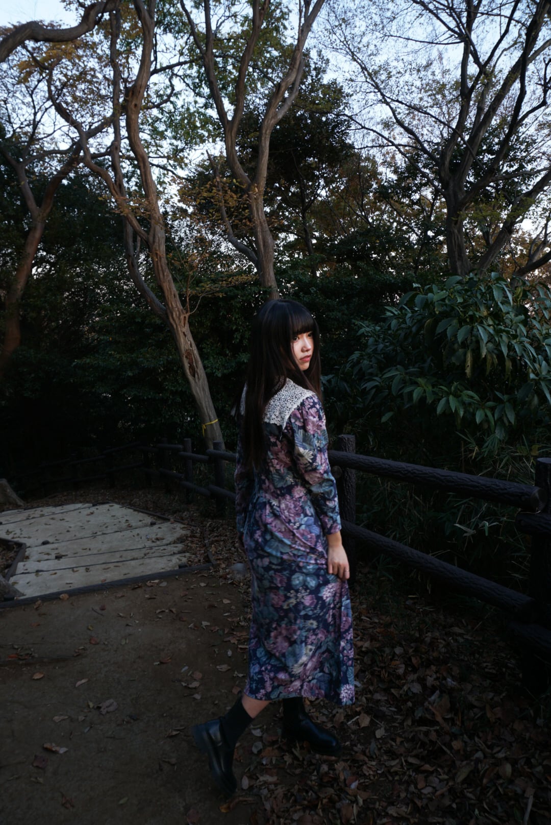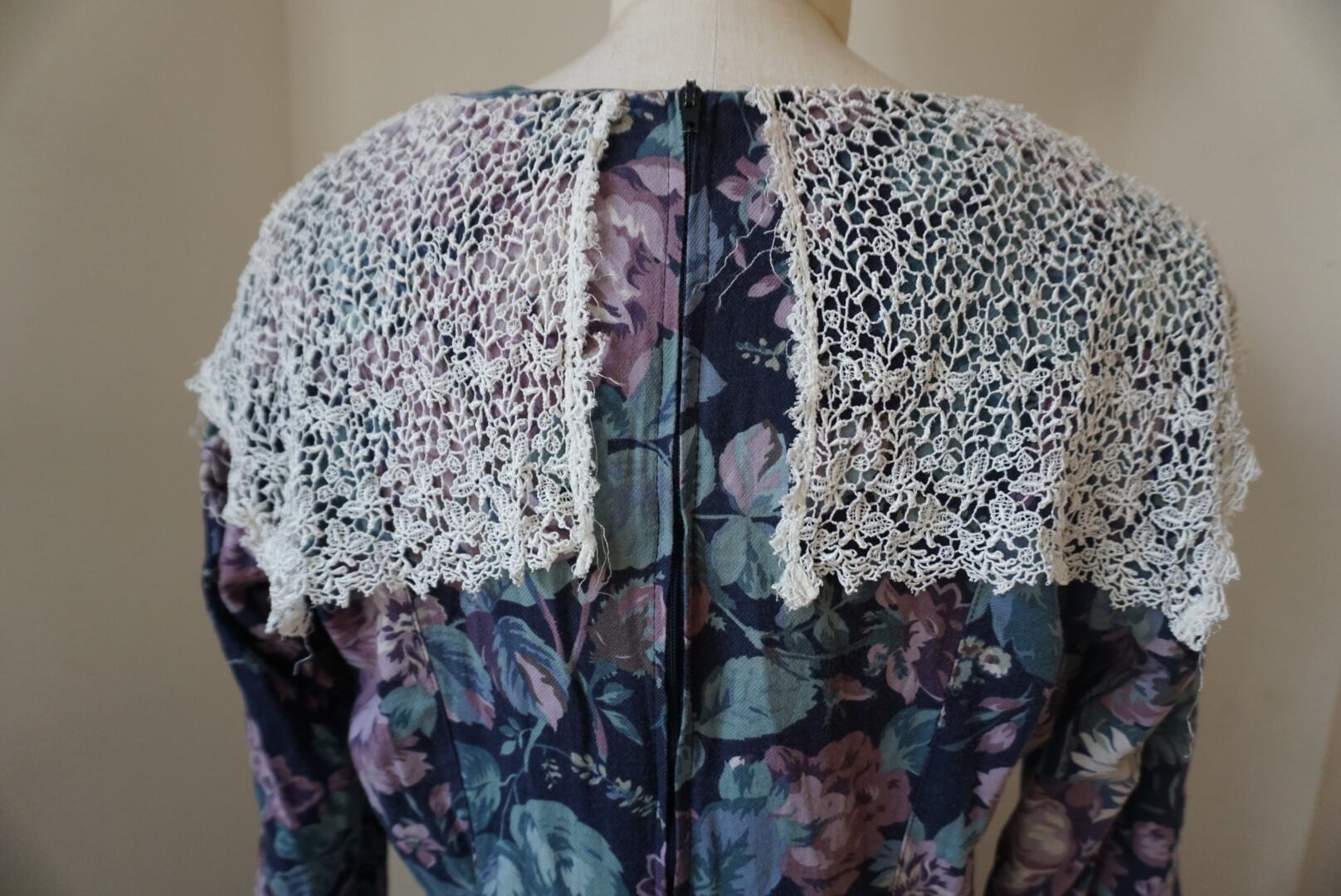 レースの襟がガーリーですが、花柄がシックなカラーなので大人な雰囲気でとてもかわいいワンピースです。
