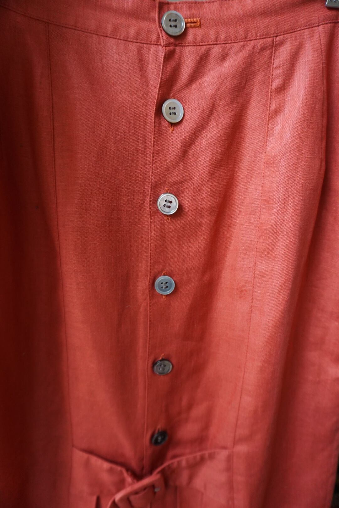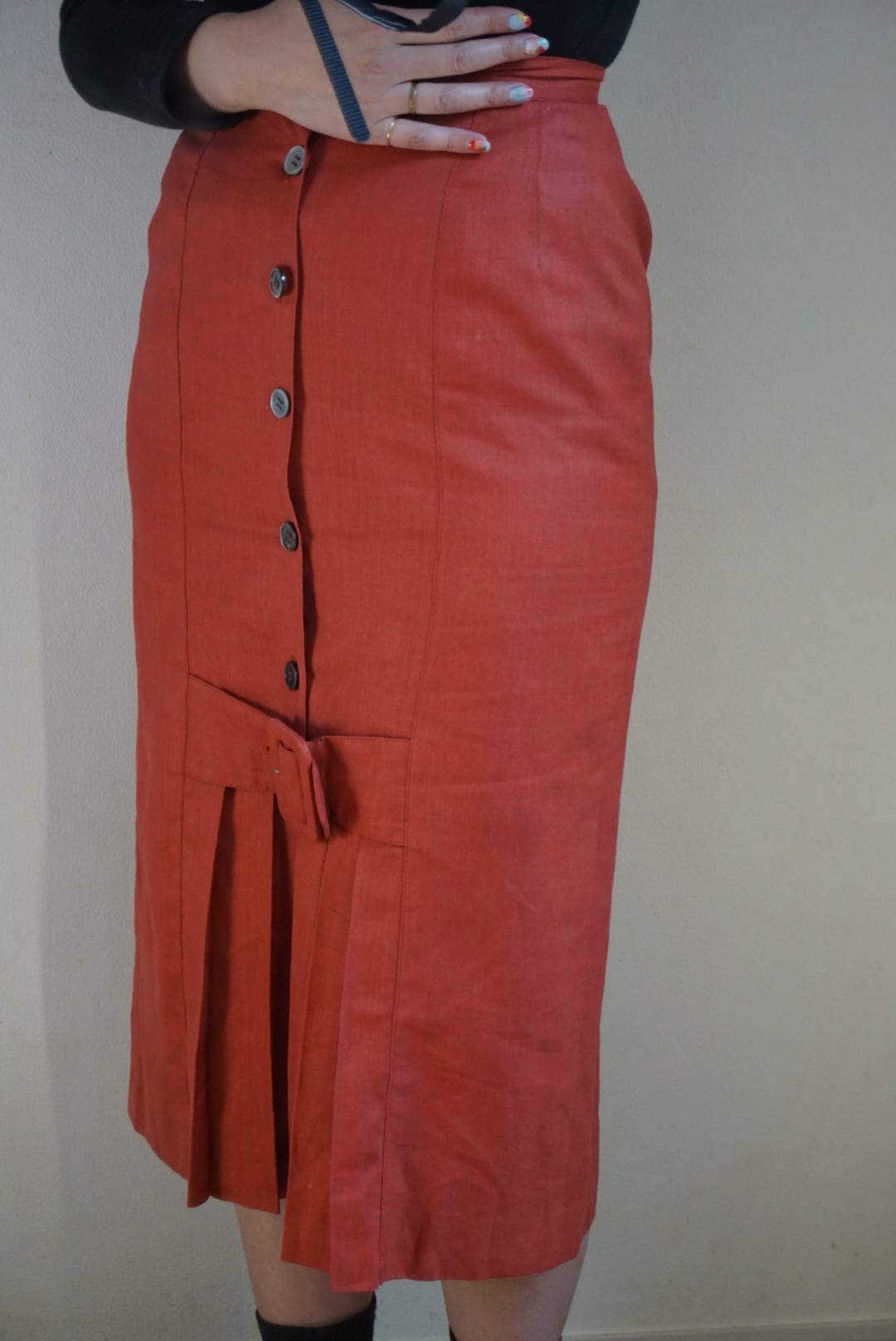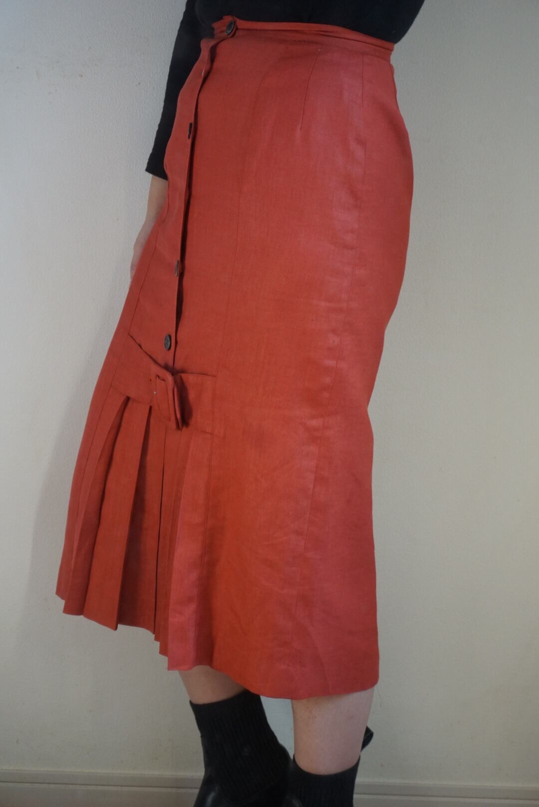 アプリコットオレンジが鮮やかでクラシックなタイトスカート。