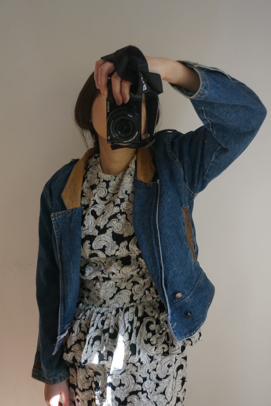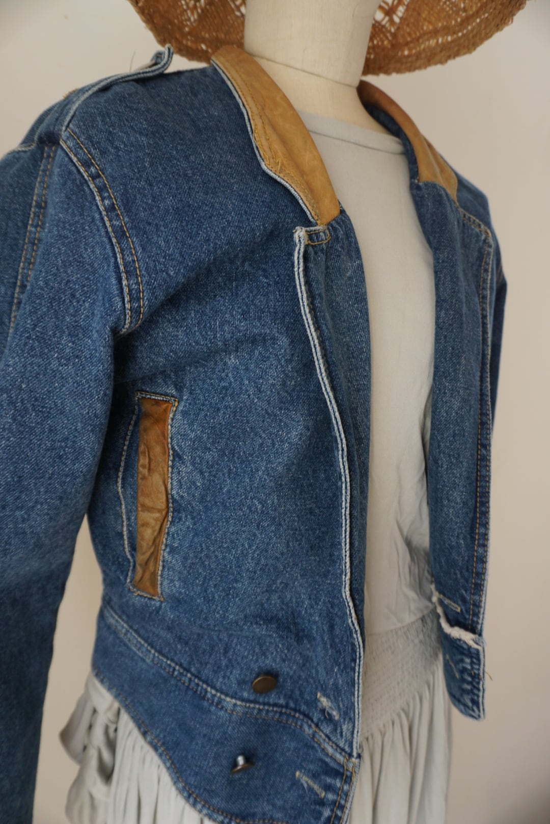 襟もとのレザーがとてもおしゃれでデニムだけのジャケットよりさらに高級感が増しています。