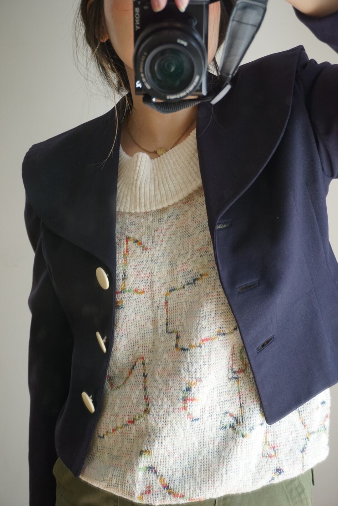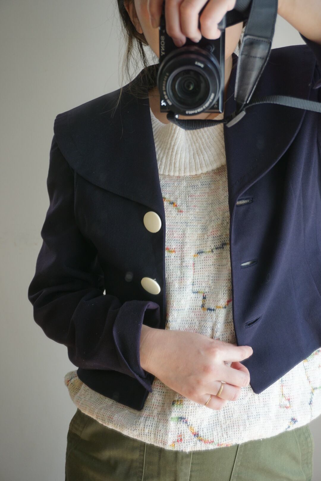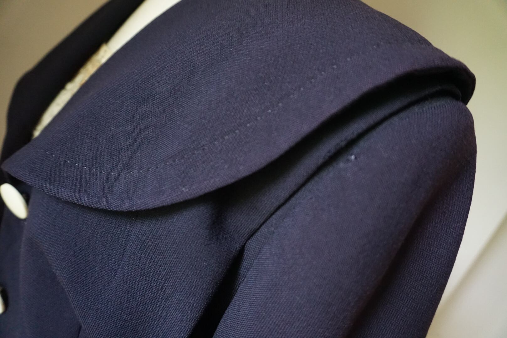 襟がセーラーのように大きく特徴的なネイビージャケット。