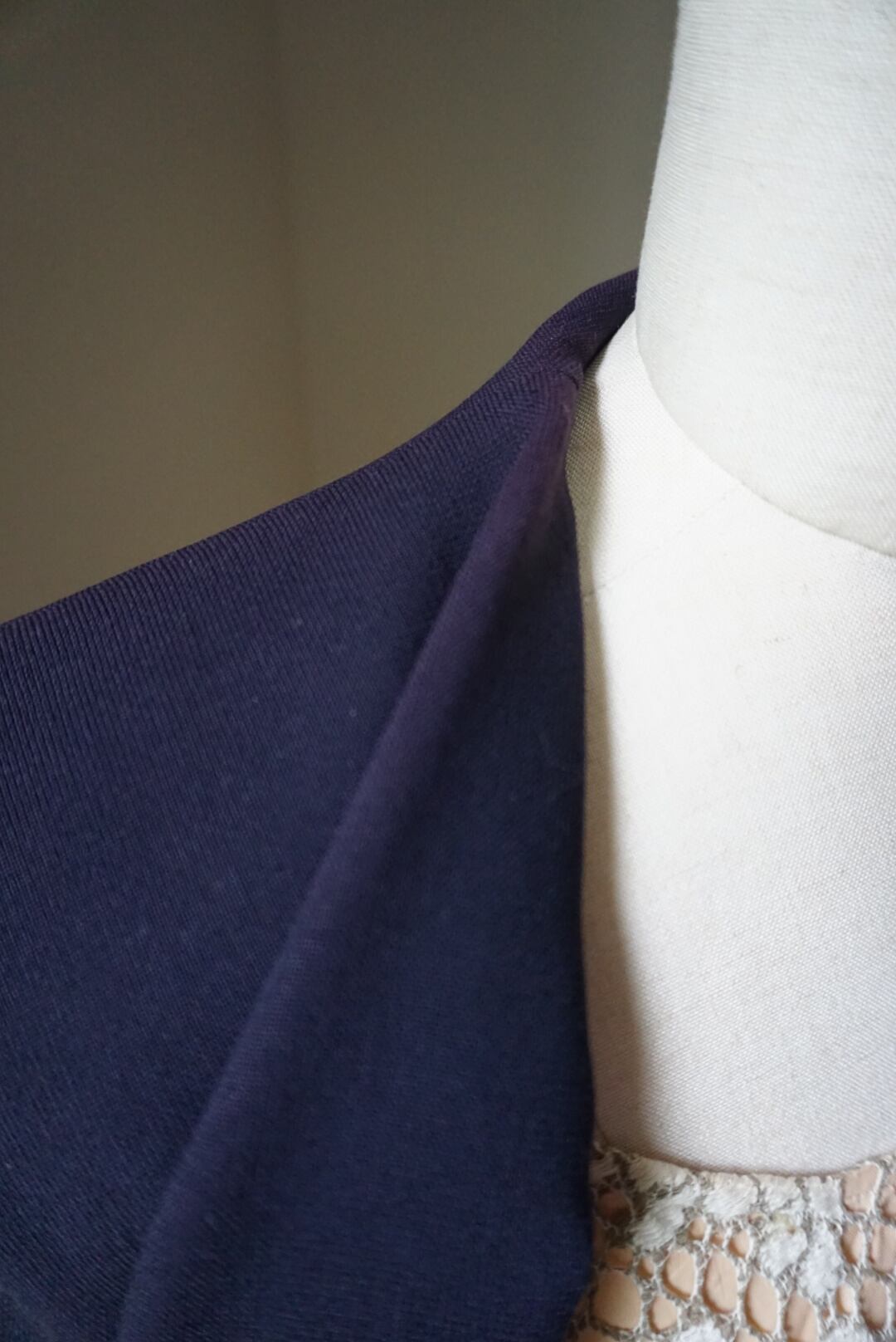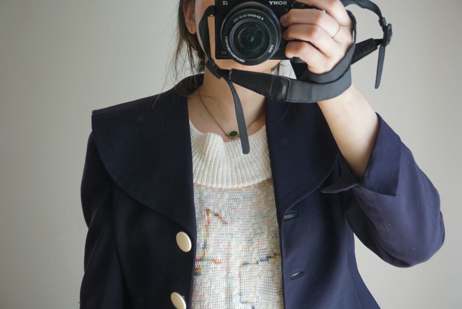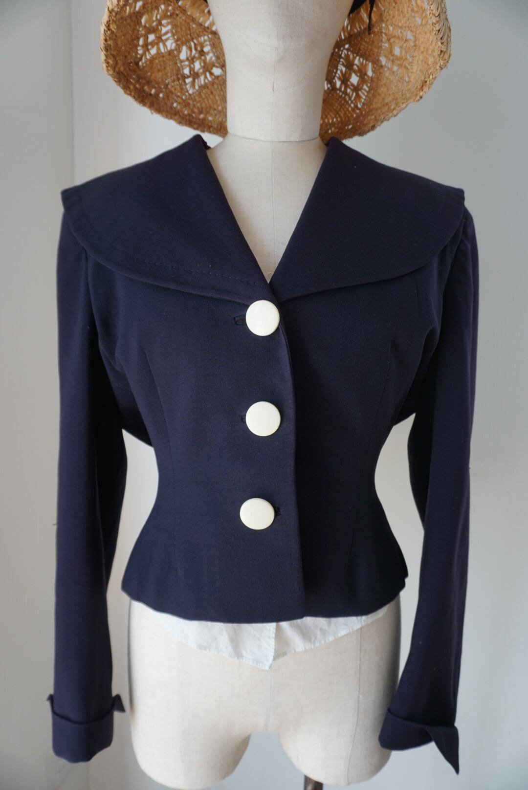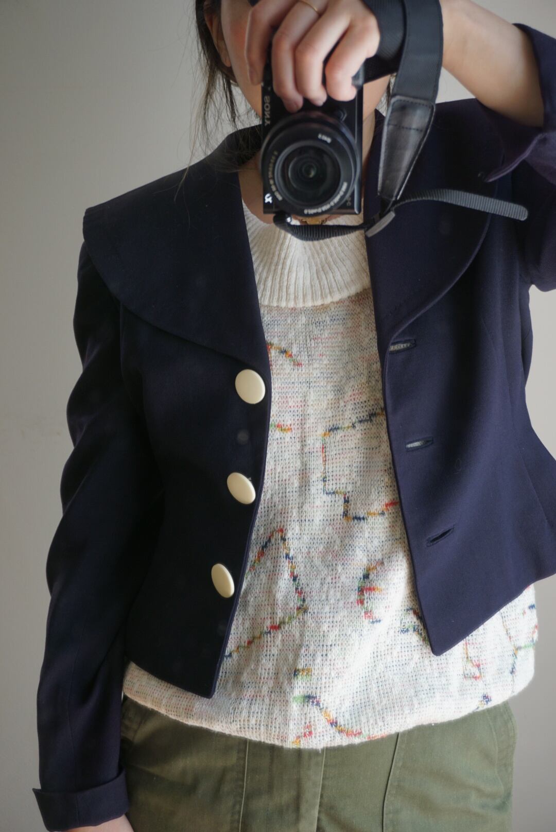 襟がセーラーのように大きく特徴的なネイビージャケット。
