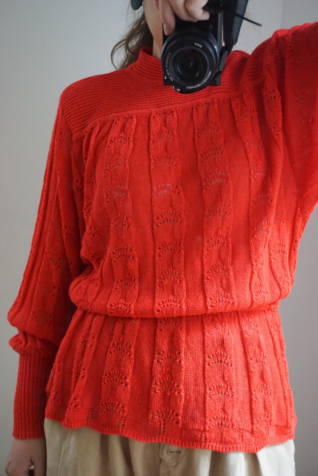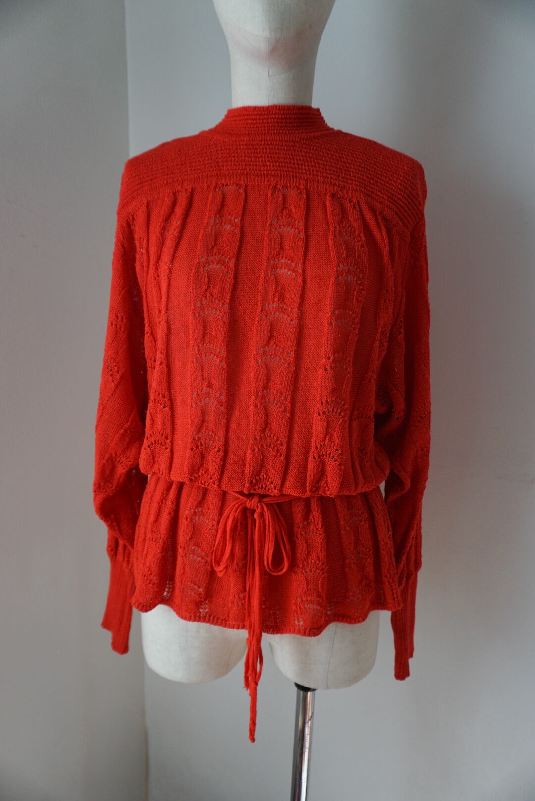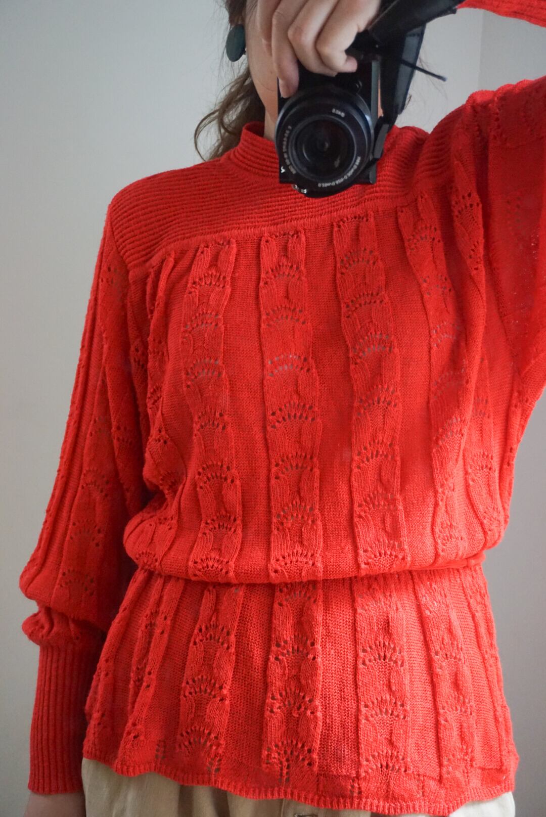 発色の良い赤で編み目が透け感もあって秋冬にとても着やすいアイテムです。