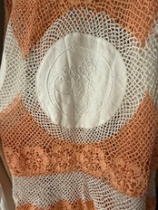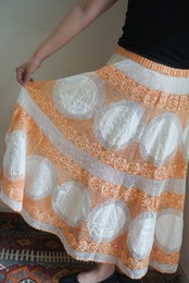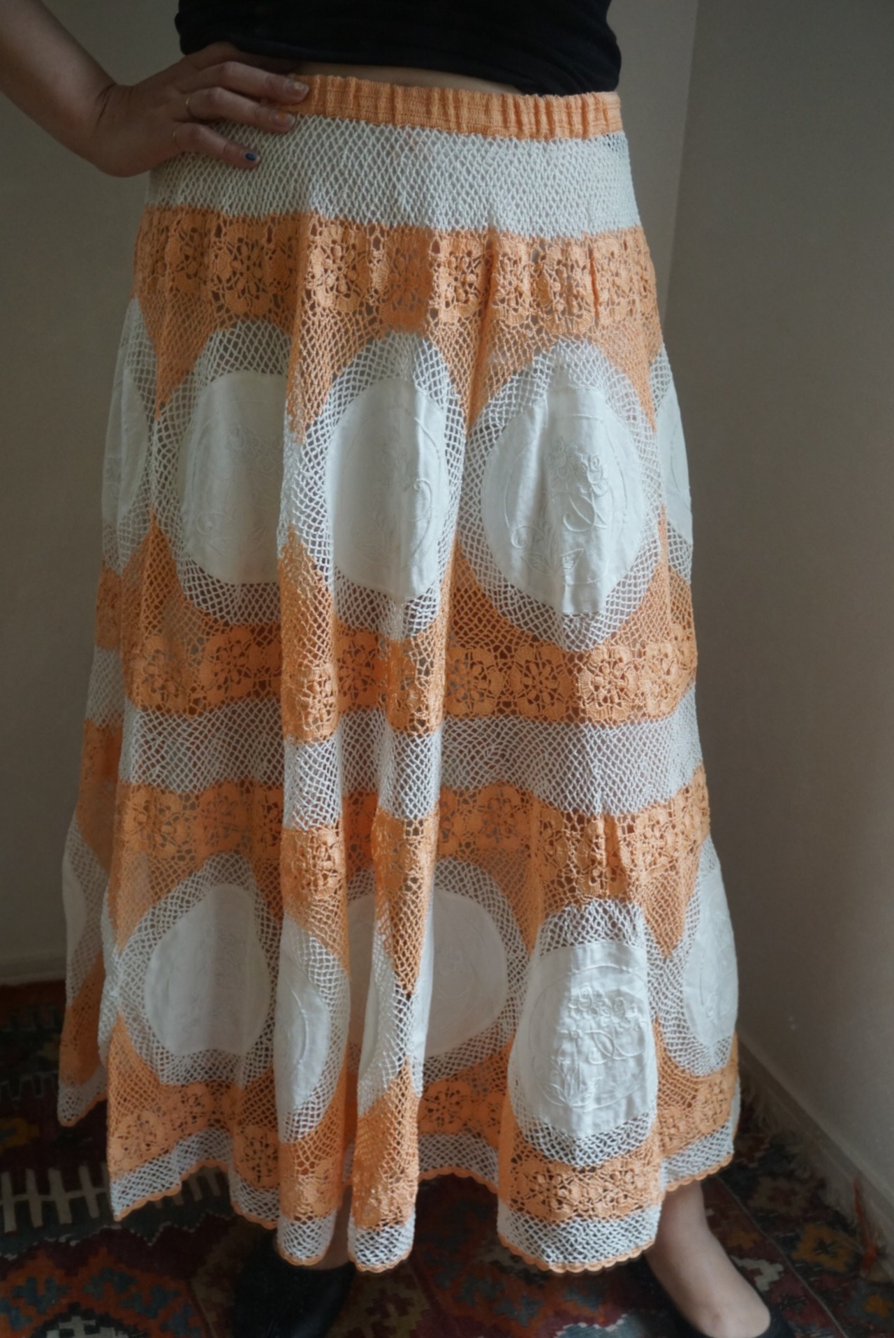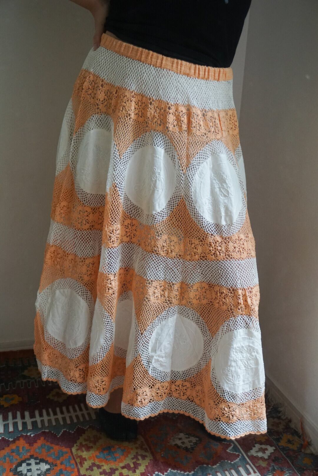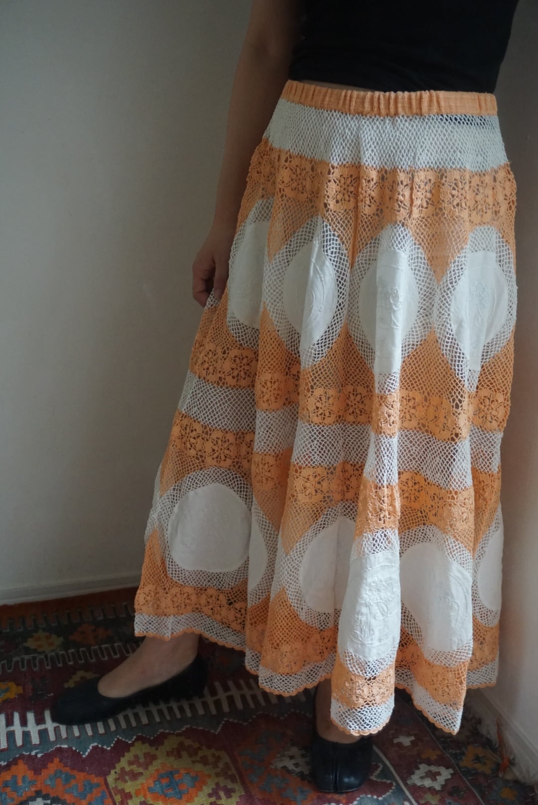 鮮やかなオレンジが目を引く、Lim’s vintageのハンドメイドクロシェスカートです。