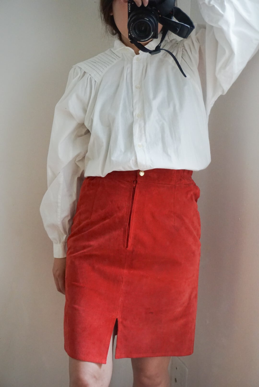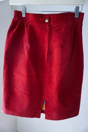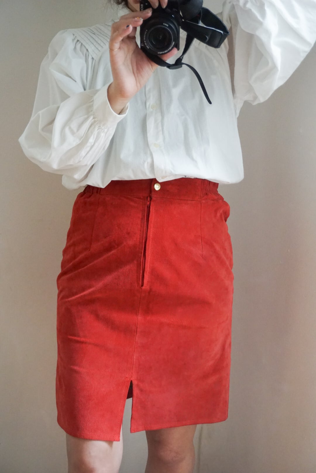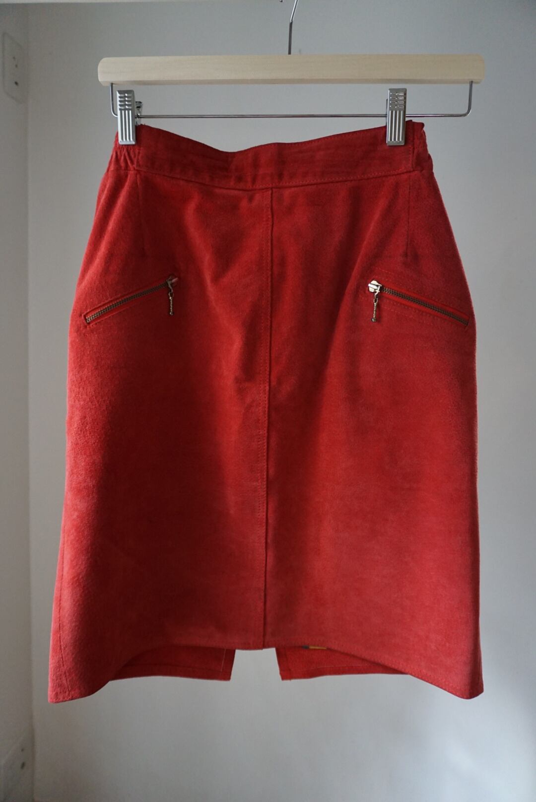 新たに入荷したこのレザースカートは、スタイリッシュな赤い色合いが特徴で、様々なコーディネートにアクセントを加えるアイテムです。