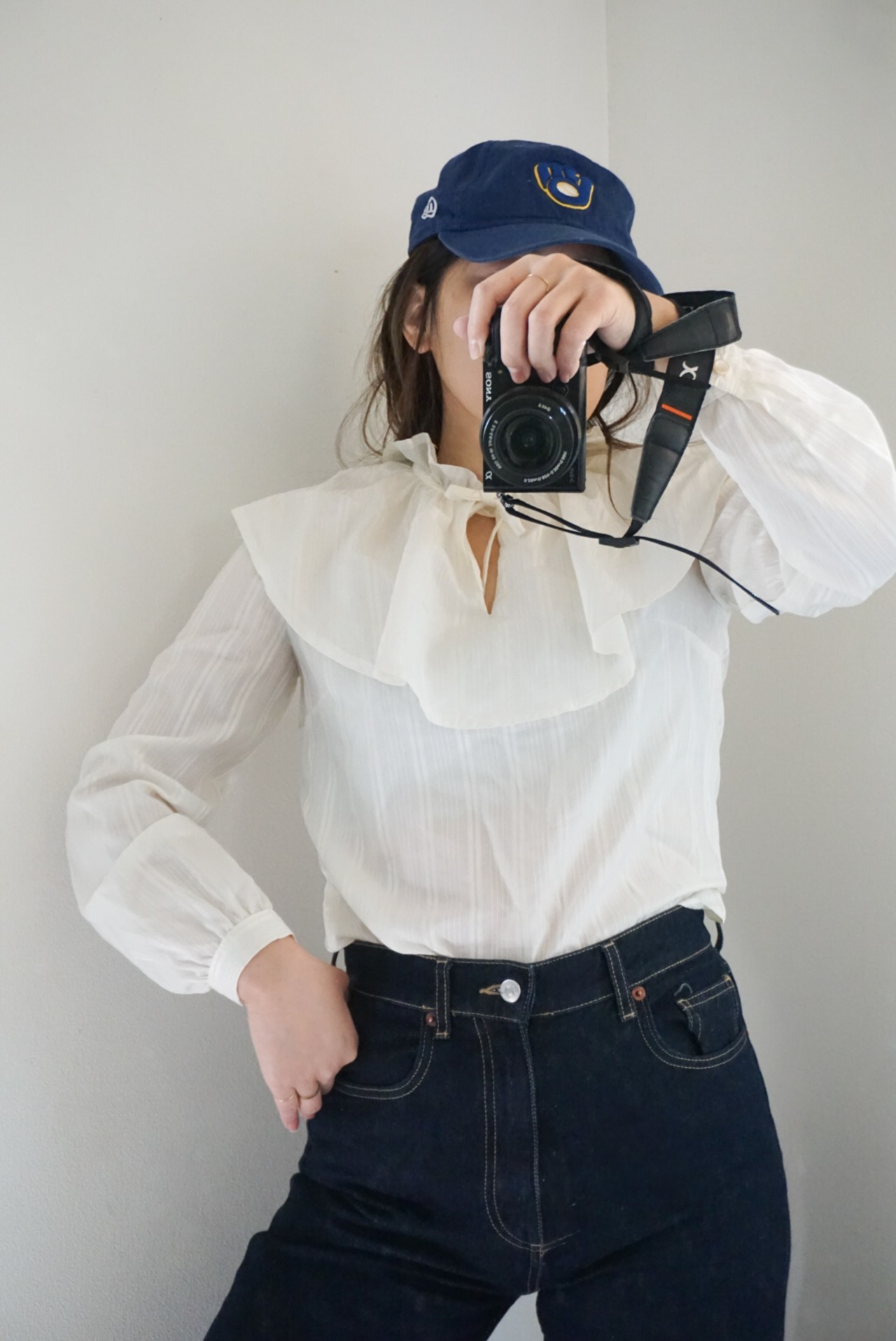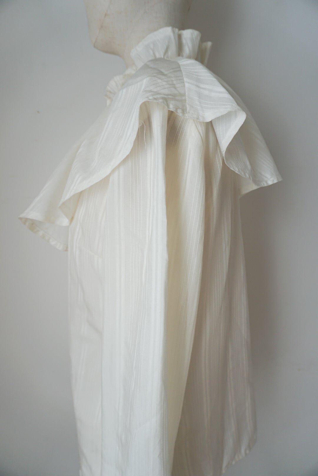 肩回り大きな襟のついたフェミニンなデザインブラウス。