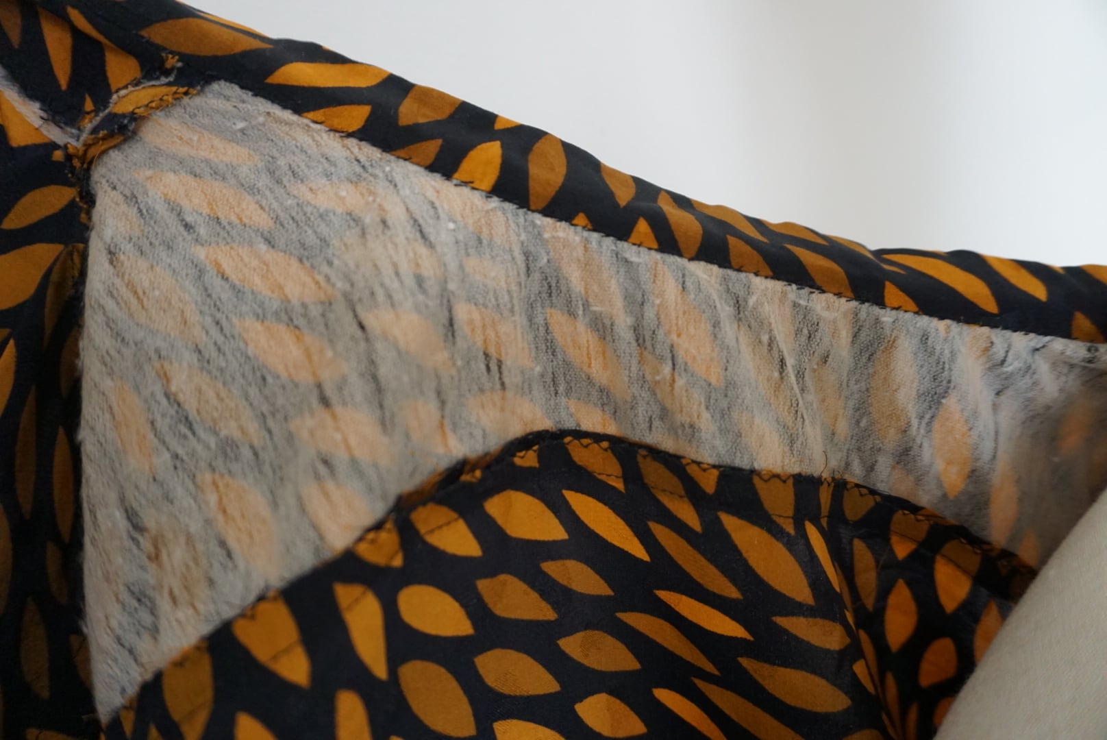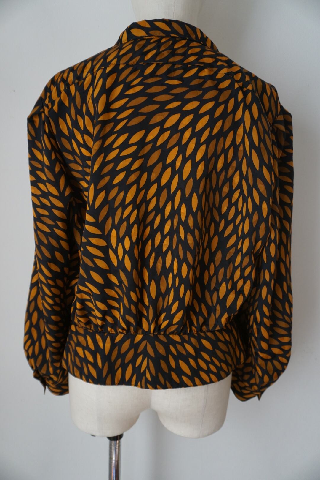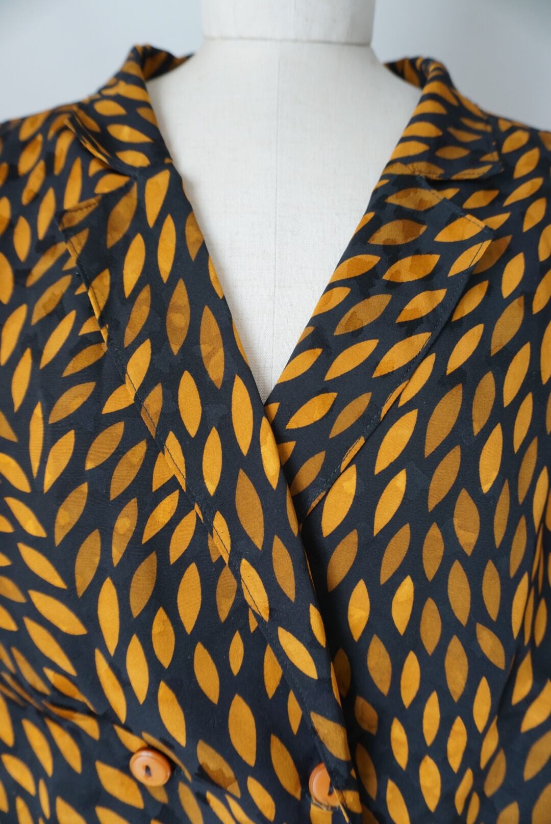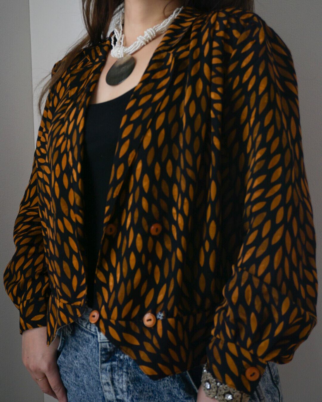 黒地にオレンジの木の葉柄で、テーラードジャケット風のデザインなのでとても個性的な着こなしができます。