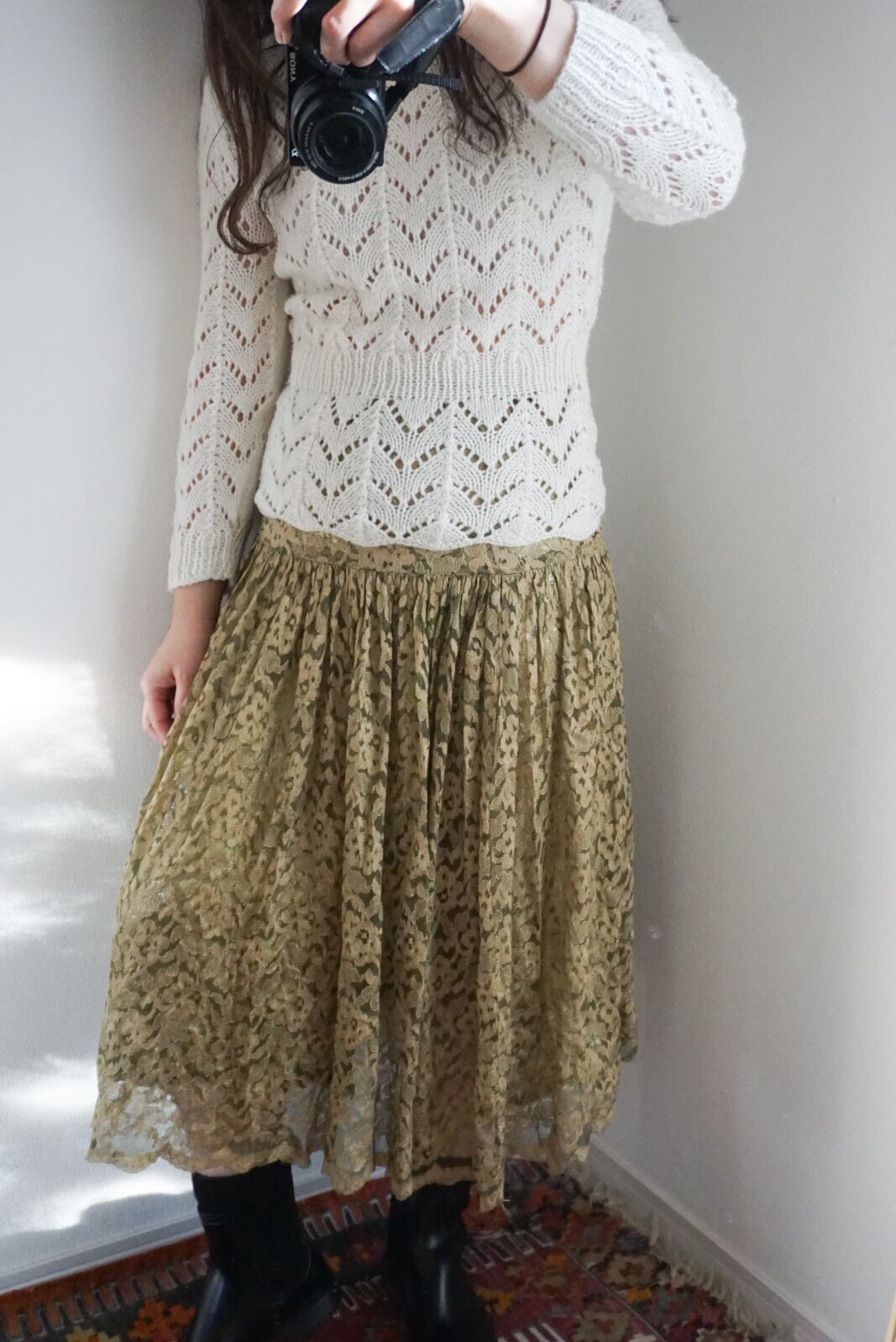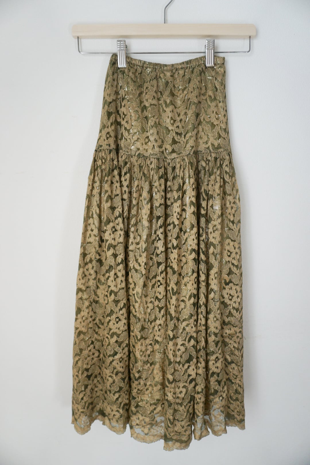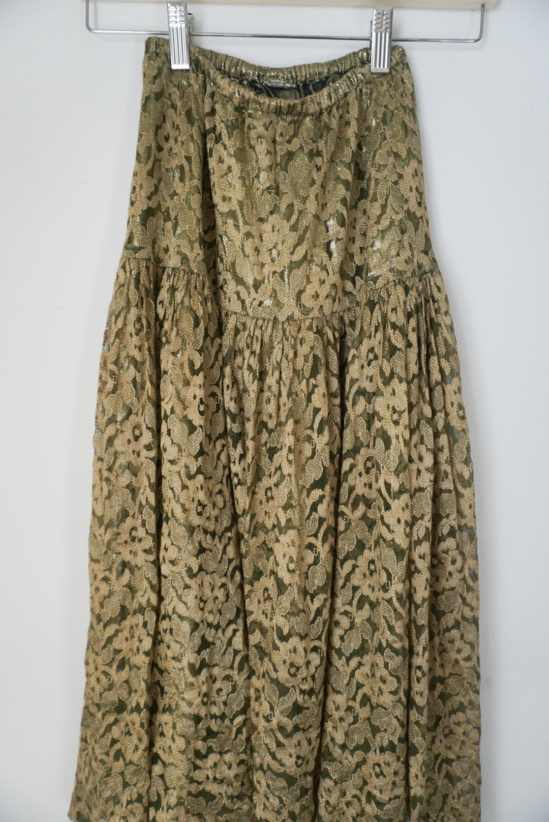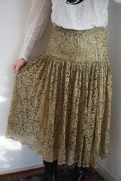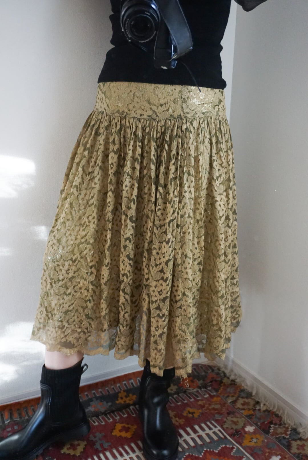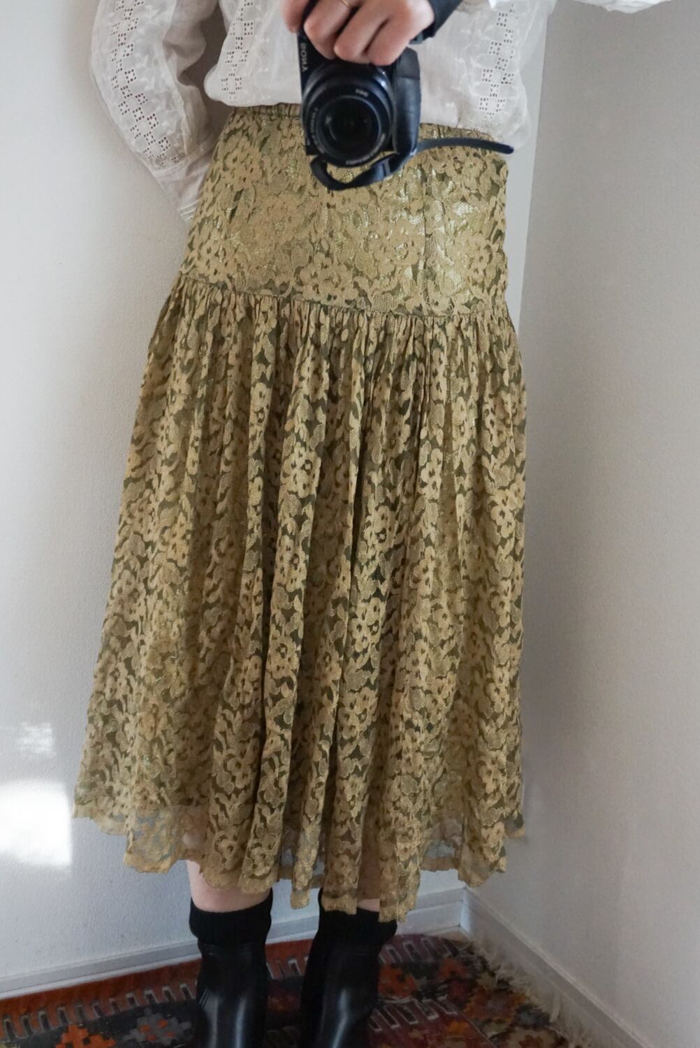 このスカートは、インナーのペチコートがゴールドで透けたレースの隙間からゴールドカラーがチラ見せできるのが特徴的で、繊細なデザインが魅力的です。
