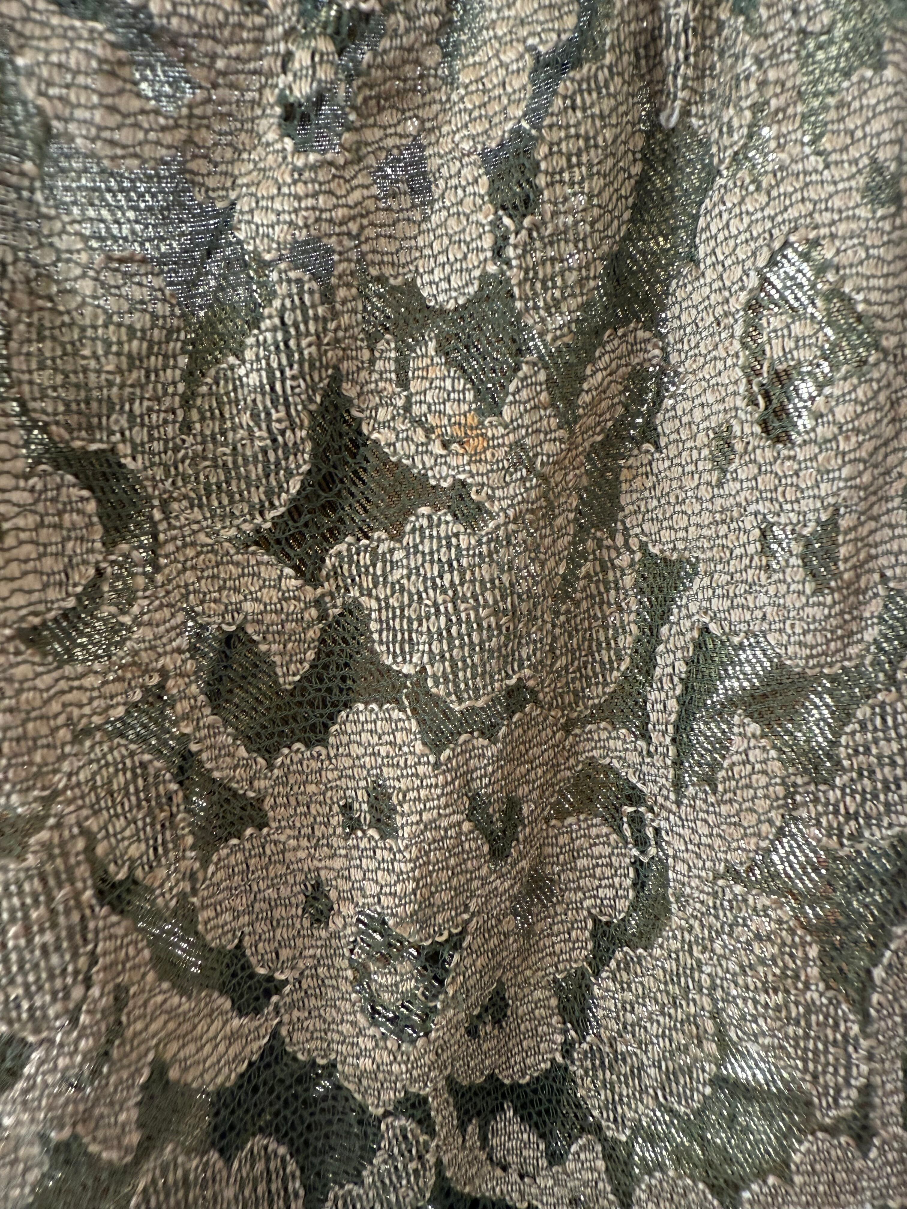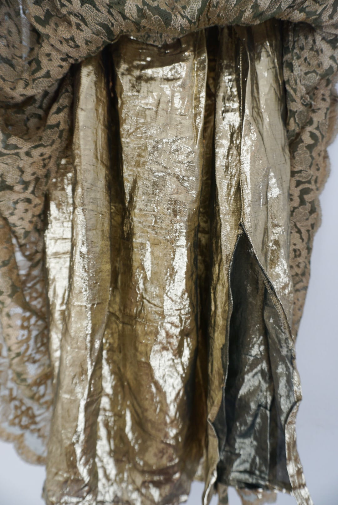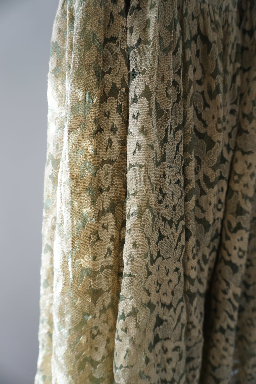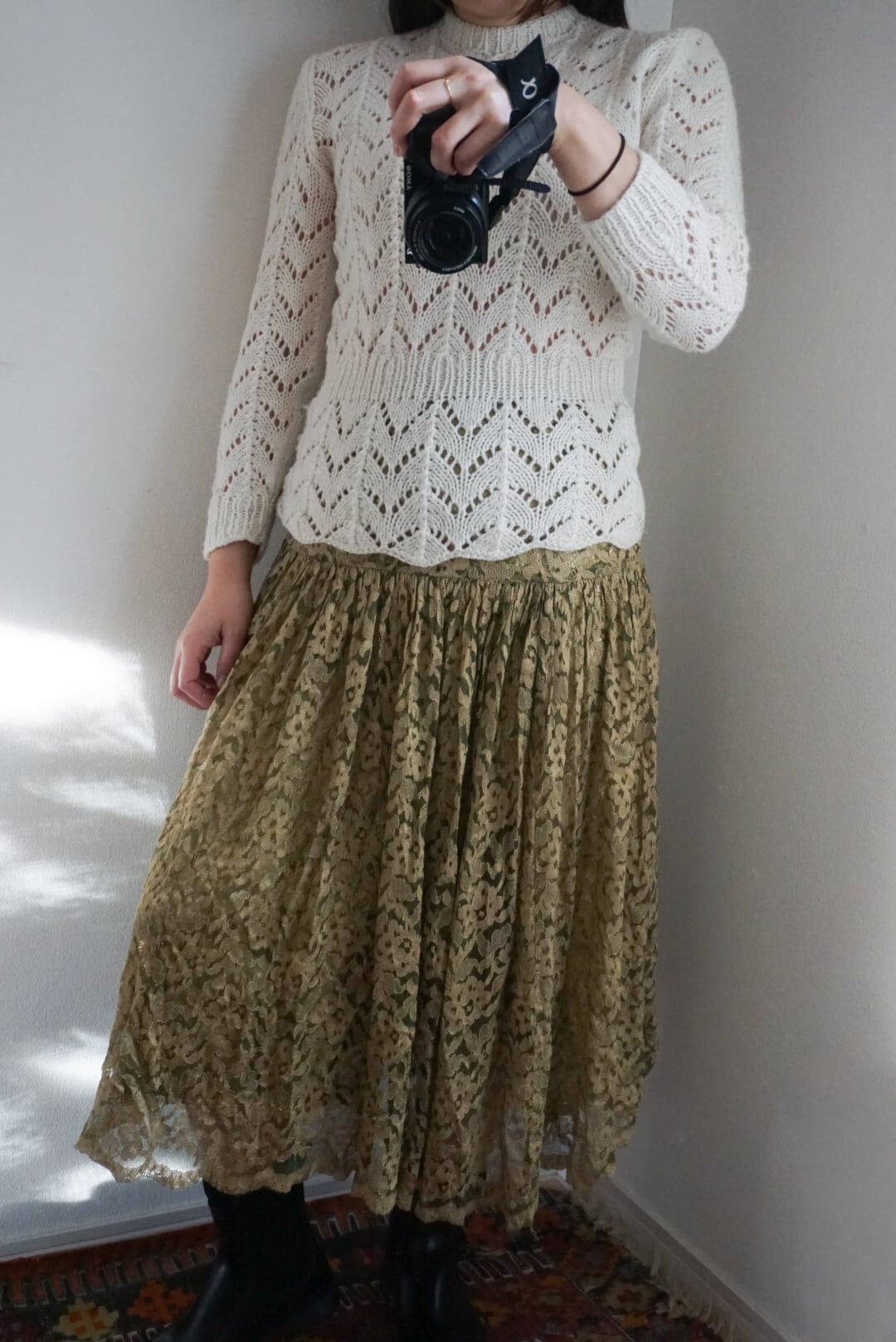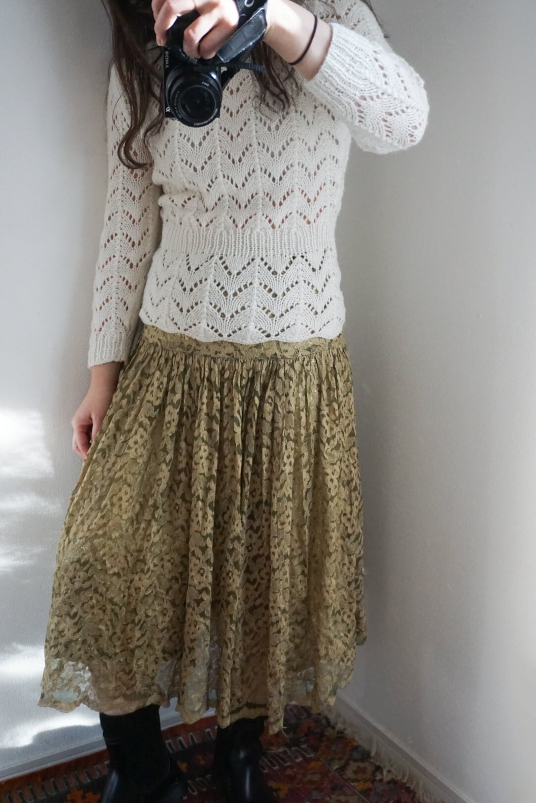 このスカートは、インナーのペチコートがゴールドで透けたレースの隙間からゴールドカラーがチラ見せできるのが特徴的で、繊細なデザインが魅力的です。