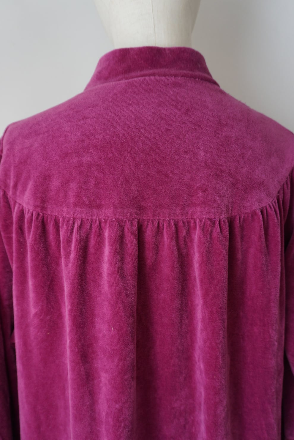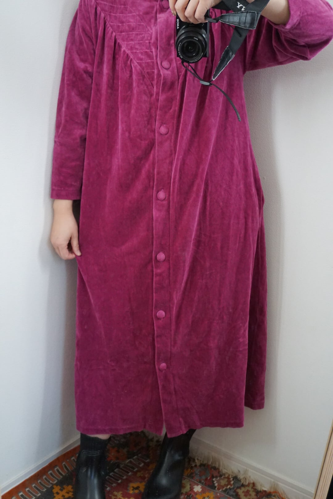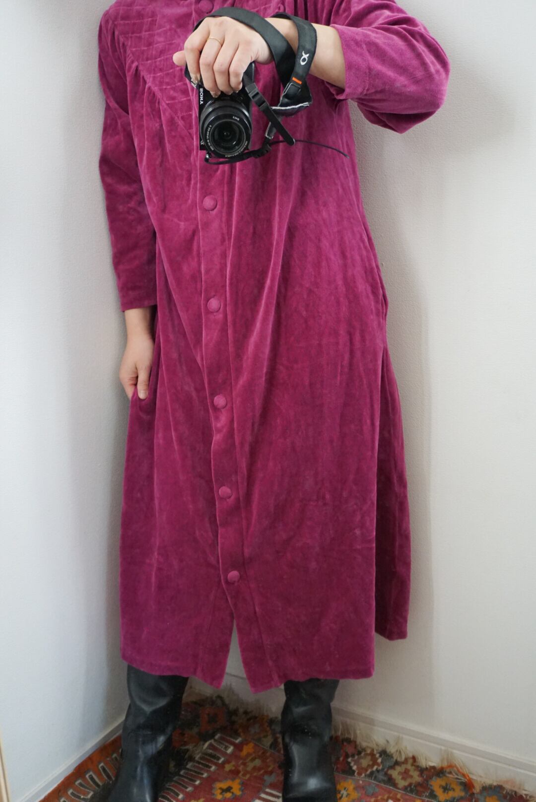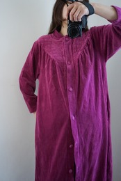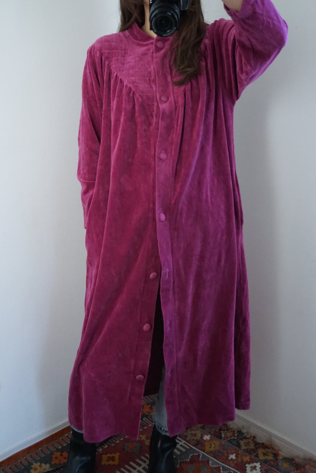 このナイトドレスは、柔らかなピンクのヴェロア素材が特徴で、優雅でありながらもリラックスした雰囲気を演出します。